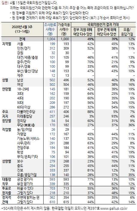 당시 더불어민주당 vs 미래통합당의 지지율은 44 vs 23