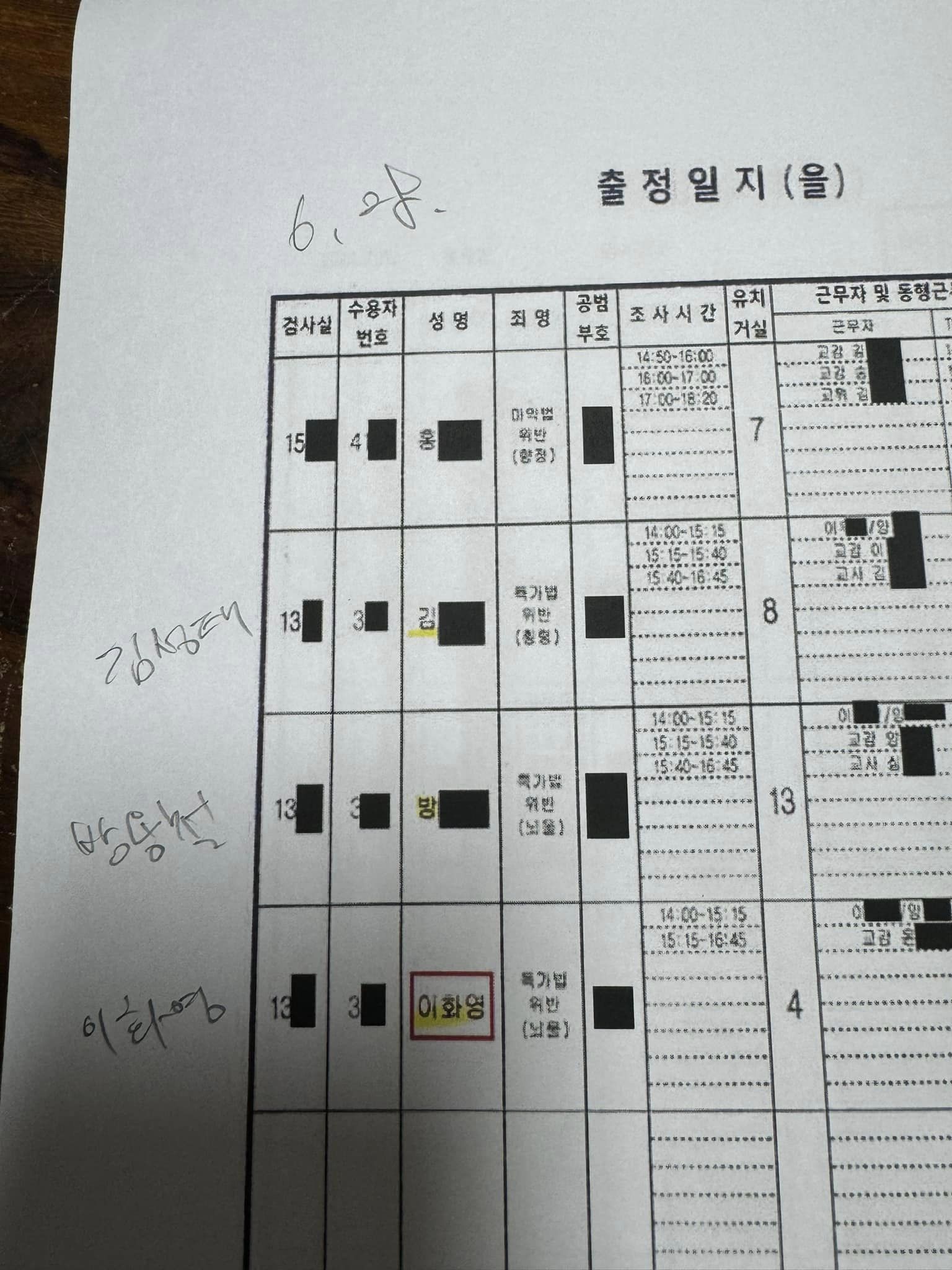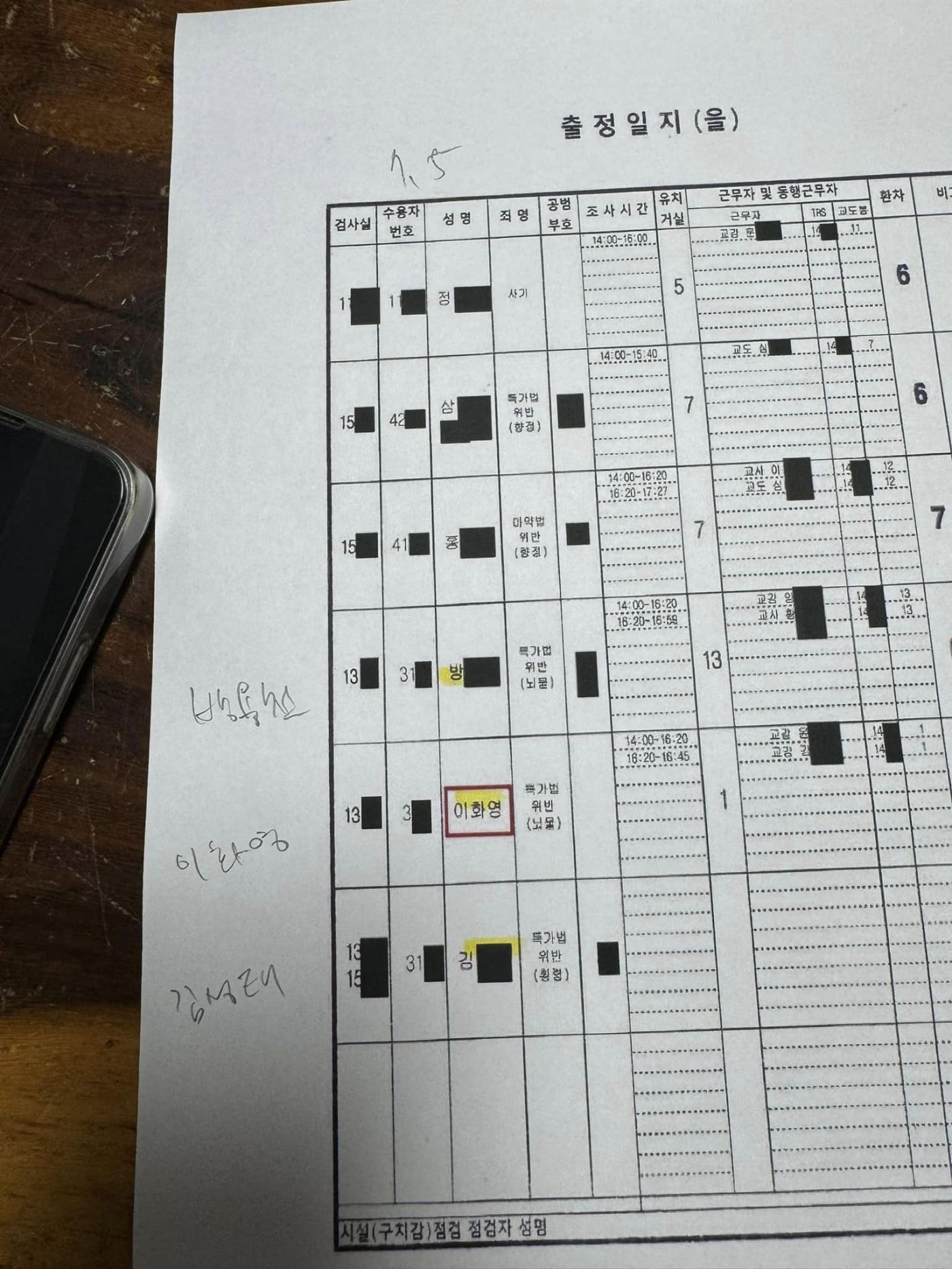 7월 3일 출정일지를 봅시다. 검찰이 너무 많은 부분에 먹칠을 해놔서 확실하진 않지만, 연합뉴스의 위 대목을 참고하여 보면 이화영 위의 방XX(특가법위반 뇌물)는 방용철 부회장으로 보이고, 아래의 김XX(특가법위반 횡령)은 김성태 회장으로 보입니다. 그런데 조사시간을 보면 이화영이 있었던 16:00-17:05는 방XX, 김XX가 있던 머물던 시간대에 완벽하게 포함됩니다. 검사실을 보니 13XX 또는 15XX인데.... 13XX는 겹치네요? 이화영은 1313호가 맞을 텐데 방XX나 김XX는 1313호가 아니어야만 합니다. 그런데 아쉽게도 먹칠을 해놔서 이화영의 주장은 파훼되지 못했습니다.