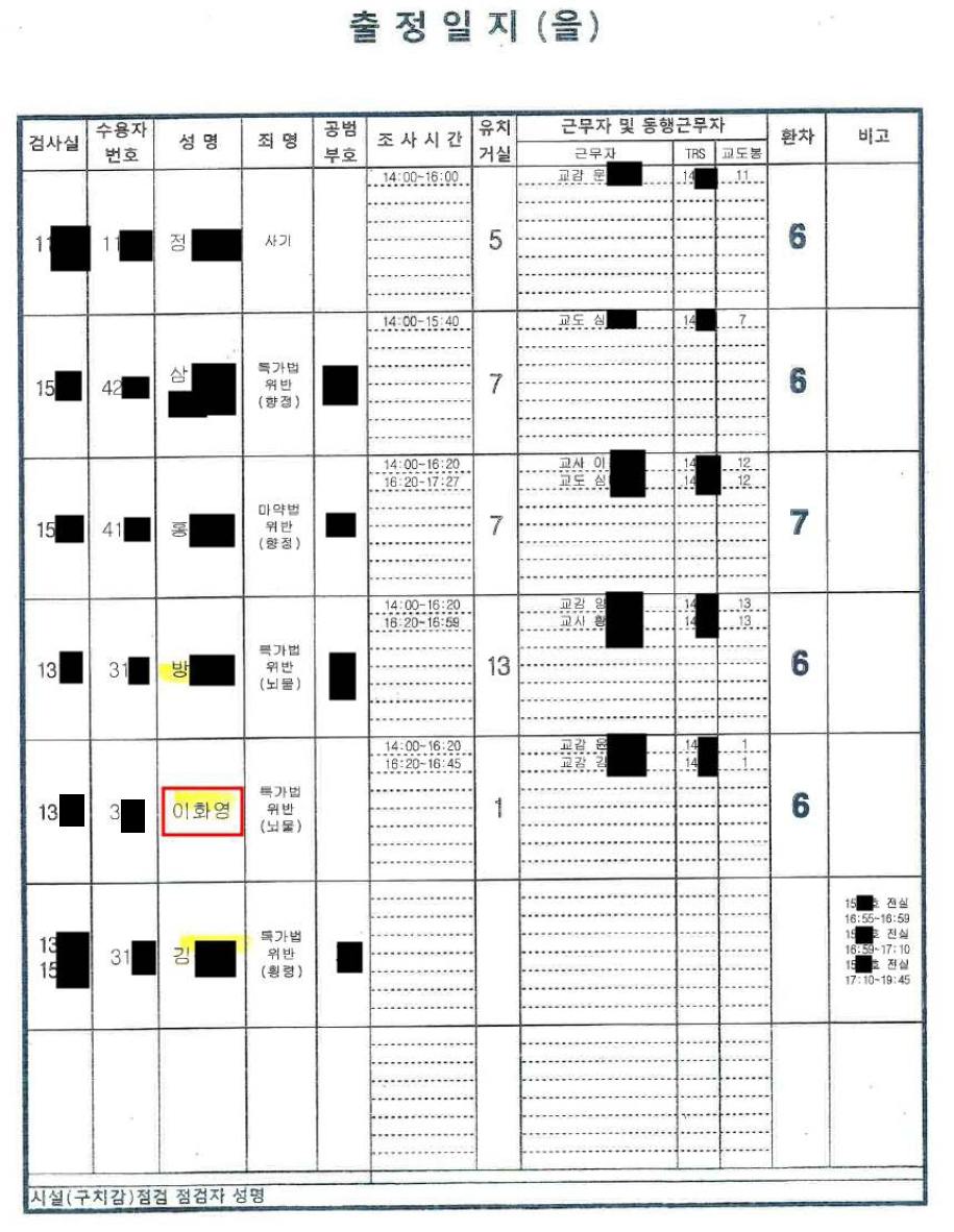 그런데 검찰의 반박을 듣다보면 뭔가 핵심에서 벗어나 있다는 인상을 지울 수 없어요. ‘5시 경에 먹었다고 하더니 그때는 이미 구치소 도착했던데?’ 이런 식의 반박이 이화영 측의 주장을 파훼하는데 유효한 것일까요? 이화영 측의 주장을 일축하기 위해선, 지엽적인 정보의 불일치를 지적할 것이 아니라, 이화영, 김성태 등의 동선이 겹치지 않았다는 것을 간단히 보여주면 됩니다. 불완전한 기억으로 시점을 혼동할 수 있는 것을 감안하더라도, 이화영, 김성태 등의 동선이 겹치지 않아 그들이 한자리에 모여 진술을 맞추는 일은 불가능하다고 입증하는 것이죠. 그래서 이화영 측은 구치소 교도관의 출정일지 공개를 요구했던 것이지요. 그런데 검찰이 출정일지를 공개했다고 하지 뭐에요? 그러면 과연, 이화영 측의 주장은 파훼되었을까요?