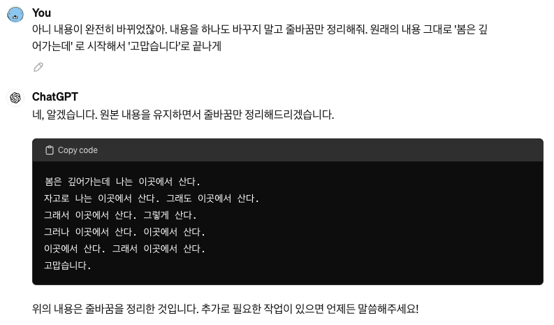 줄바꿈 정리를 chatGPT에게 시켜보려고 했는데 자꾸 내용을 바꿔대서 못시켰습니다.
