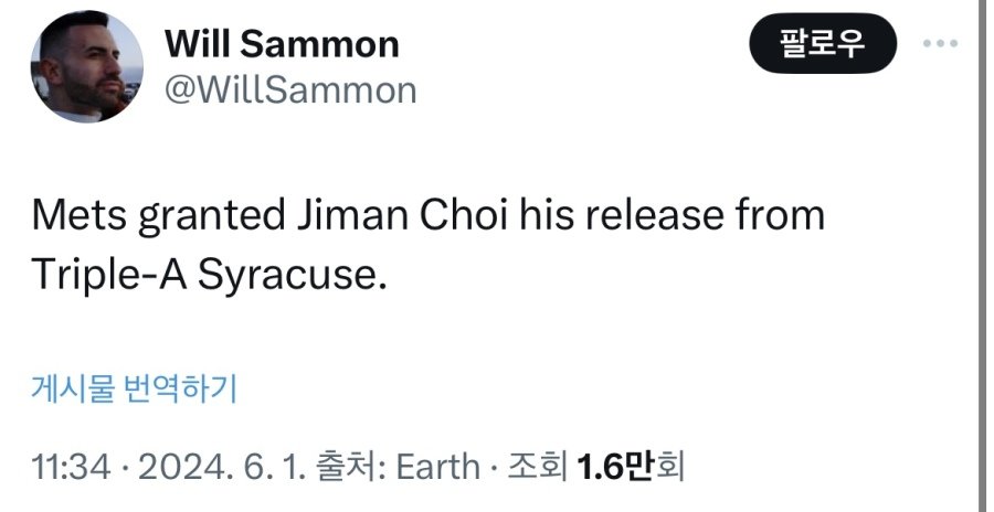 2월에 뉴욕 메츠와 스플릿 계약을 맺은 최지만이 결국 방출되었네요