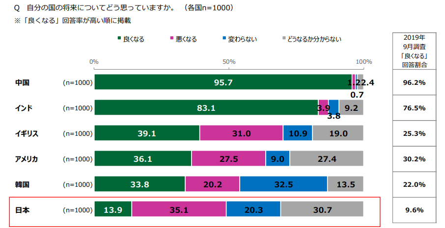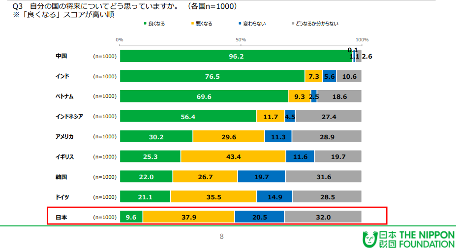 ![]() 위 사진은 2024년 2월 일본 재단이 17-19세 청년 남녀를 대상으로 각국당 1000명씩 온라인 조사한 결과입니다. (원 출처는 Link #1, 이를 보도한 한국 기사는 Link #2 참조) 한국인 입장에서 결과가 놀라워서 한번 올려봅니다. 국가명은 위에서 아래로 중국 - 인도 - 한국 - 미국 - 영국 - 일본 순. 초록색: 지금보다 나아진다, 파란색: 지금보다 나빠진다, 회색: 지금과 그대로다, 줄무늬색: 잘 모르겠다 중국 인도가 유독 긍정적인데 여긴 개도국이라 그럴 수 있다 치고 (예전에 올렸던 https://www.redtea.kr/recommended/1279 이 설문조사에도 비슷한 패턴이 나타납니다) 선진국인 한국, 미국, 영국, 일본 중 한국 청년들이 제일 낙관적인 게 눈에 띱니다. 네 선진국 중에서 낙관이 비관을 앞선 유일한 국가가 한국입니다. 참고로 이 기관은 2022년, 2019년에도 비슷한 설문조사를 한 바 있는데 ![]() (2019년): 중국 - 인도 - 베트남 - 인도네시아 - 미국 - 영국 - 한국 - 독일 - 일본 순입니다. 여기서는 초록색이 나아진다, 노란색이 나빠진다, 파란색이 그대로, 회색이 모르겠다.