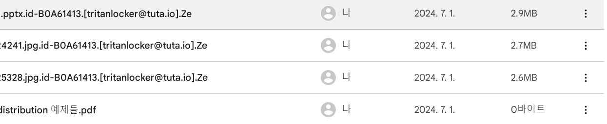 다행히 컴퓨터에는 그리 중요한 파일들이 없어서 포맷 중입니다만 구글 드라이브까지 감염(컴퓨터와 동기화 시켜놨었는데 클라우드까지 파일을 다 락 시켜버렸습니다). 또 다행히 메인 드라이브는 백업이 되어있는 상태라서 데이터 손실은 없을 것 같습니다.