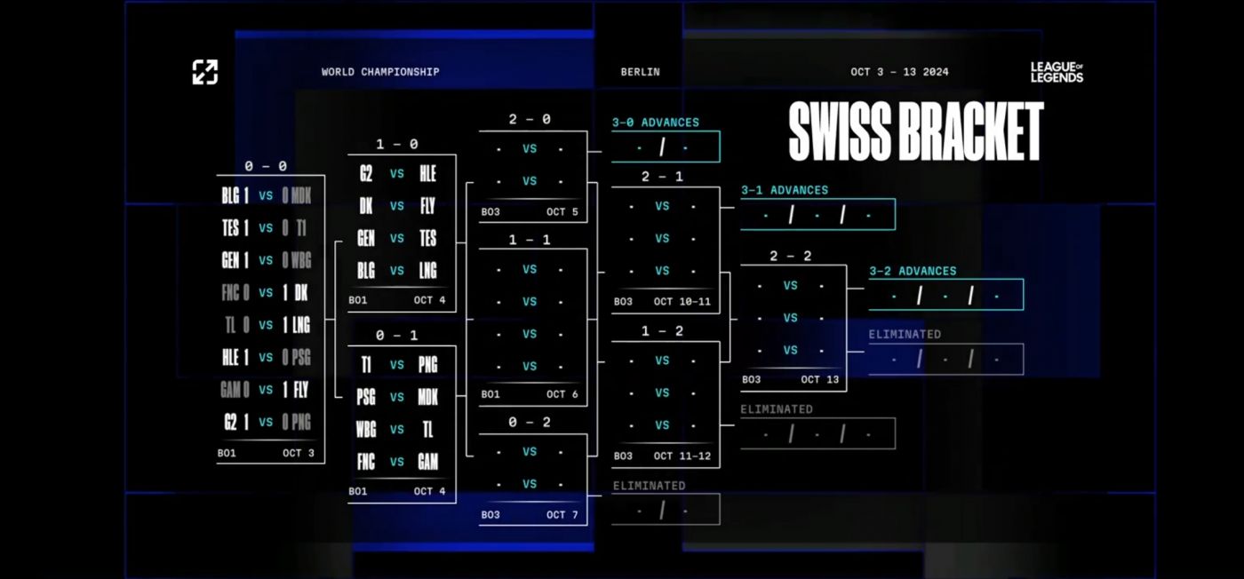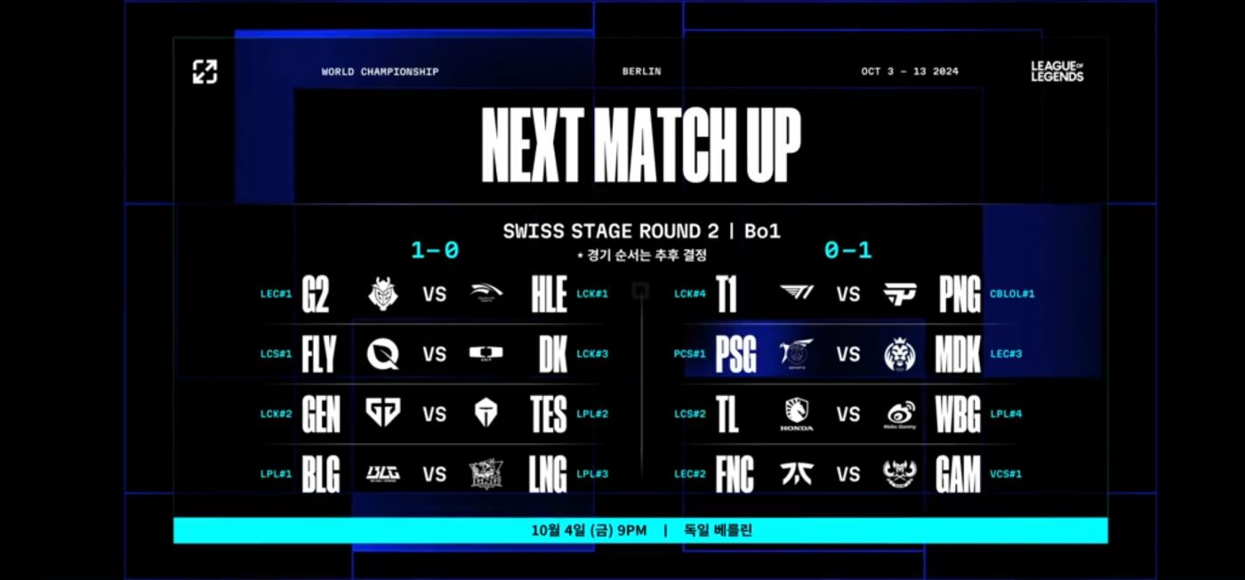 2024 월드 챔피언십 스위스 스테이지 2라운드(독일 베를린, Riot Games Arena,14.18버전,단판) 21 : 00 Bilibili Gaming DreamSmart vs LNG Ninebot Esports 22 : 00 Gen.G vs Top Esports 23 : 00 G2 Esports vs Hanwha Life Esports (밤 12시) 00 : 00 Team Liquid Honda vs Weibo Gaming TapTap 01 : 00 T1 vs paiN Gaming 02 : 00 Dplus KIA vs FlyQuest 03 : 00 Fnatic vs GAM Esports 04 : 00 PSG Talon vs MAD Lions KOI 금목서 속 은목서 : 아침 7시까지 기다렸다가 12시에 일어났읍니다. 여기서 1승 1패 팀은 단판 이고,나머지는 다 3판입니다. 낼은 출근해서 글이 늦게 올라올 예정입니다 0