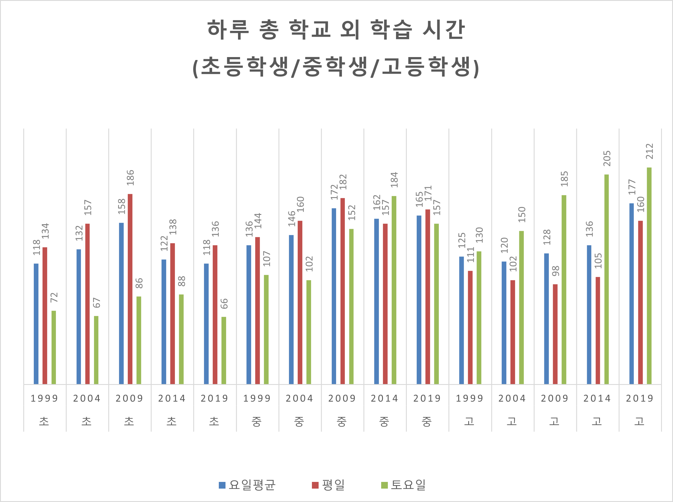 한국 교육의 변화와 문제를 말하는 사람들은 많은데, 데이터에 기반한 이야기가 많치 않은 것 같습니다. 특히 데이터 쪽 이야기가 드문 게 아쉬움. 그래서 생활시간조사 1999-2019년 데이터로 드러난 학습시간 변화를 중점으로, 한국 교육의 변화와 (잠재적) 문제를 이야기하고 싶습니다. 원 데이터엔 일요일도 있는데 가독성 문제로 제외했습니다. 2024년 데이터는 작년에 조사되어 올해 발표될 예정인데 어떨지 궁금하네요. ![]() 보시다시피 1999년부터 2009년까지는 초, 중. 고의 학습시간이 그대로 유지됩니다만, 그 이후 학습시간이 학교급을 막론하고 크게 감소합니다. 완전 등교일 -> 놀토/갈토 병행체제-> 완전 휴교일로 전환되는 과정에서 토요일 학습시간의 감소가 돋보입니다만, 평일도 감소세에서 예외는 아닙니다. 전반적으로 학습시간 자체가 2010년 이후 크게 감소하는 추세입니다. 참고로 이 학습시간은 학교 내, 학교 외를 합산한 수치라서, 학교 내와 학교 외를 분리해서 보겠습니다. ![]() 먼저 학교 내입니다. 학교 내 학습시간은 전체 학습시간과 마찬가지로 2009년까지 그대로 유지되다가 그 이후 크게 감소하고 있습니다. 완전 휴일화에 의한 토요일의 급격한 감소가 돋보이네요. 눈대중으로 감소폭은 전체 학습시간보다 더 큰 느낌입니다. 학생들이 새벽에 등교했다가 한 밤중에 하교한다는 한국 교육의 클리셰는 급격하게 과거의 일이 되어가고 있습니다. 개인적으로도 몇년 전에 모교를 어쩌다 지난 적이 있는데, 4시 무렵에 단체로 하교하는 학생들을 봤습니다. 저 땐 반강제적인 야간자율학습을 했는데, 별로 괴롭진 않았고 추억으로 남습니다만 보면서 많은 만감이 교차하는 건 어쩔 수가 없네요. ![]() 그런데 학교 외 학습시간(대부분이 과외나 학원, 자습일)은 트렌드가 좀 다릅니다. 초등학교는 패턴이 혼란스러워서 잘 모르겠는데, 중학교와 고등학교는 학교 외 학습시간이 갈수록 늘어나는 경향성을 보입니다. 중학교는 2000년대에 증가했다면 고등학교는 2010년대에 급격하게 증가했습니다. 특히 고등학교는 1인당 사교육비의 급격한 증가와 시점이 일맥상통합니다. 학교 내 학습시간의 급격한 감소, 그리고 학교 외 학습시간의 일부 증가는 주목할 만한 현상입니다. 비록 학습시간 전체가 줄었지만, 교내외 여부로 가르면 어느정도 대조가 되고 있는 겁니다. 이걸 전반적인 학습시간 감소와 결부지으면, 한국의 교육 변화와 (잠재적) 문제에 있어 많은 함의가 나타납니다. 첫째. 지금 아동, 청소년들은 더 이상 과거처럼 무식하게 많이 공부하지 않습니다. 2000년대까지는 한국 학생들이 무식하게 많이 공부한다는 클리셰가 통하지만, 2010년대부터는 아닙니다. 그러면서도 PISA 점수가 상대적으로 안정적으로 유지된 거라 매우 대단한 성취입니다. PISA 점수가 다소 하락했다고 볼 순 있지만, 전세계 최상위권에서 벗어나지 않는 한국 교육 성취의 우수성은 잃지 않았습니다. 코로나19로 전세계 공교육이 초토화되는 와중에 한국은 선방했습니다. 이는 좋은 의미로 일본을 따라가는 겁니다. 일본은 과거에 비해 공부시간은 많이 줄었지만(그리고 부활동은 늘어났지만), PISA 최상위권은 유지하고 있거든요. 그걸 가지고 동아시아가 단순히 무식하게 공부 많이해서 공부를 잘한다는 클리셰에 반론한 학자도 있습니다. 한국도 그 사례에 들어가고 있으니, 한국 더 나아가 동아시아 교육의 성취와 의의를 다시 돌아볼 때가 온 것 같습니다. 둘째, 한국은 '학교 안'에 한정하자면 너무 적게 공부해서 문제일 수 있는 사회가 되었습니다. 먼저, 한국의 교육시간 감소는 급격해서 교육과정 파행이 의심될 수준입니다. 수학 관련해서 배우는 내용이 많이 줄었다고 이공계인들이 반발하고 있는데, 이것과도 관련 있을 듯 합니다. 또한, 특히 고등학교에서, 교내 학습시간의 감소가 교외 학습시간(대부분은 과외, 사교육) 증가와 동시에 일어났습니다. 이는 교육 총량의 부분적인(총 학습시간은 분명 줄었으므로) 풍선효과를 암시합니다. 실증분석을 해봐야겠지만 가능성으로는 생각해볼 만 합니다. 어찌보면 근래 사교육의 급격한 증가의 한 원인일 수 있기 때문입니다. 단순한 학업 문제만은 아닙니다. 한국 초등학교는 타 선진국에 비해 일찍 하교하며, 이로 인한 보육 관련 여성 경력단절 문제가 심각합니다. 미취학 아동 경력단절은 많이 완화되었는데 취학연령 아동 경력단절은 상대적으로 감소세가 약합니다. 그래서 늘봄학교 정책도 나온 건데, 교내 학습시간이 너무 작아진 게 문제의 원인일 수 있다는 생각 정도는 해볼 필요가 있습니다. 2
