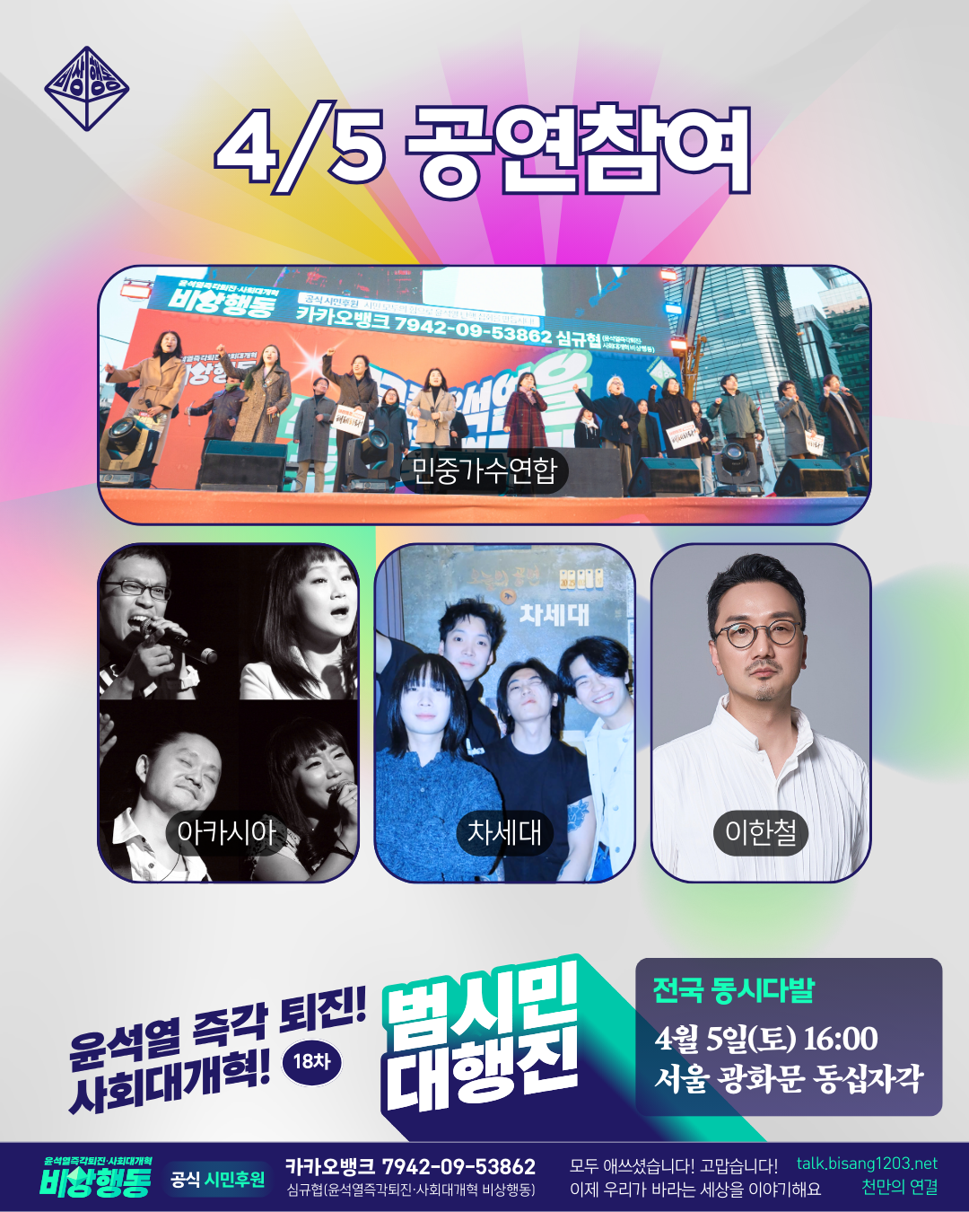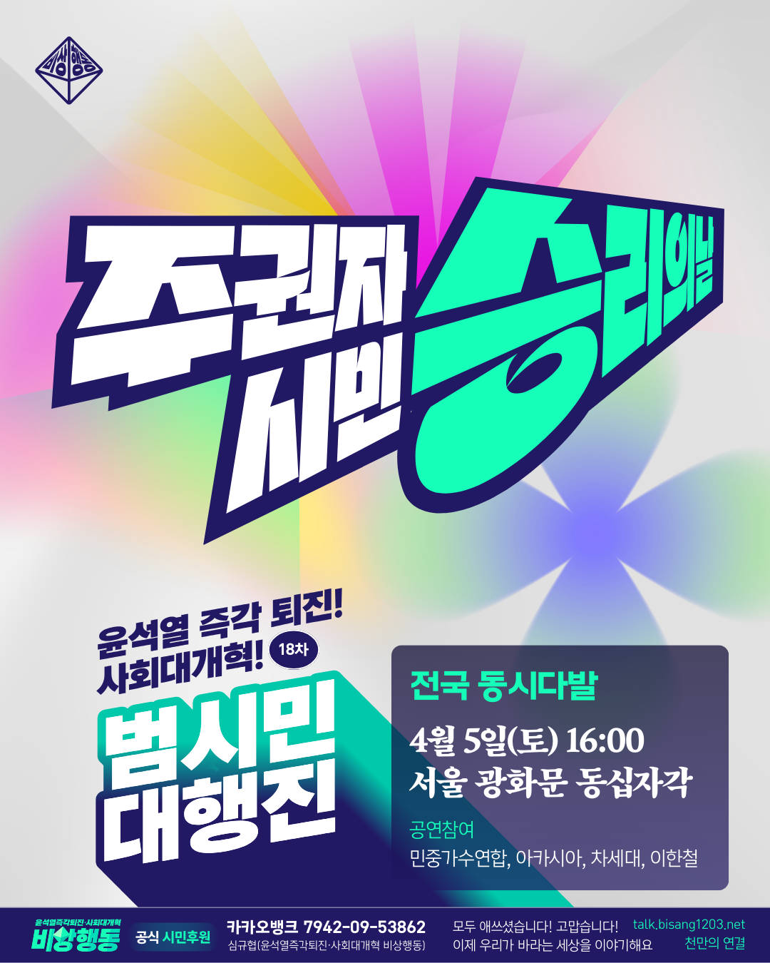 내일(4월 5일) 오후 4시에 광화문 동십자각에서 제 18주차 집회가 있습니다. 일단 내란수괴 윤석열의 파면이 오늘부로 끝났으므로 아마도 이게 마지막 집회가 될 것으로 보입니다. 시위보다는 축제에 가까운 성격이 되겠죠. 물론 집회의 주최측인 비상행동측에서 추가로 더 진행할 수도 있겠으나, 홍차넷에서 내란수괴 탄핵을 위한 집회 겸 오프모임은 일단은 이번이 마지막이 될 것으로 보입니다. 혹시라도 길었던 내란의 밤을 종식시키는 마무리 파티를 하러 오시는 분들은 알려주시기 바랍니다. 같이 식사라도 컨택해서 하고 싶습니다. 현재 참가자 : 빈둥님(+ 남편분), 노바로마 p.s. 이 게시글의 원래 제목을 지어주신 K-이안 브레머(舊 삼유인생)님께 특별히 감사를 표합니다. 4