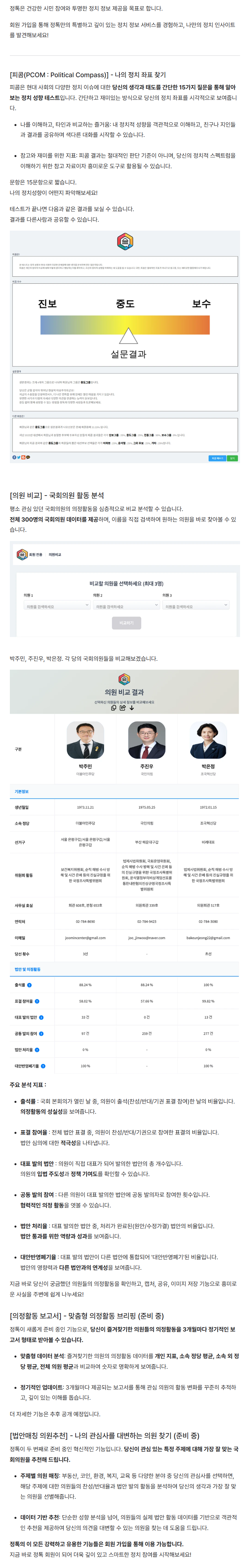 다른곳에도 있는 기능들도 많지만, '시각화된 표결 정보'라든가 '국회의원 의정활동 비교'는 국내에 다른 사이트에는 없는거 같더라구요.