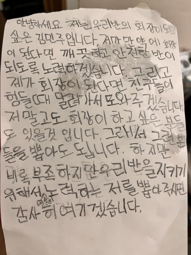 반장 선거 나간다며 어떻게 준비하냐고 저희한테 물어봤는데, 한번 직접 써보라고만 하고 말았는데 헐...