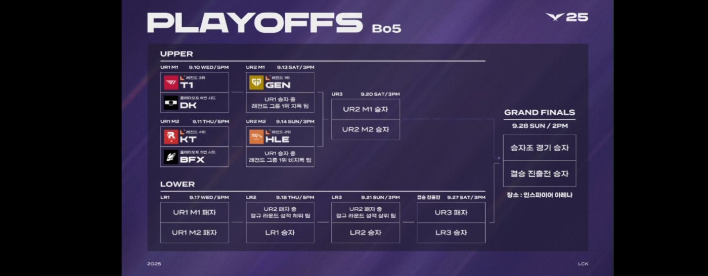 2025 League of Legends Champions Korea 플레이오프 1라운드 1일차 LCK Arena (치지직,숲,유튜브,5판 3선승제) 17 : 00 T1 vs Dplus KIA 금목서 속 은목서 : 플옵 글을 처음 올려보나 봅니다? 월즈 선발전을 겹하므로 올려봅니다. 최종 순위 그대로 진출합니다. 3위인 티원이 디+기를 지명했읍니다 0