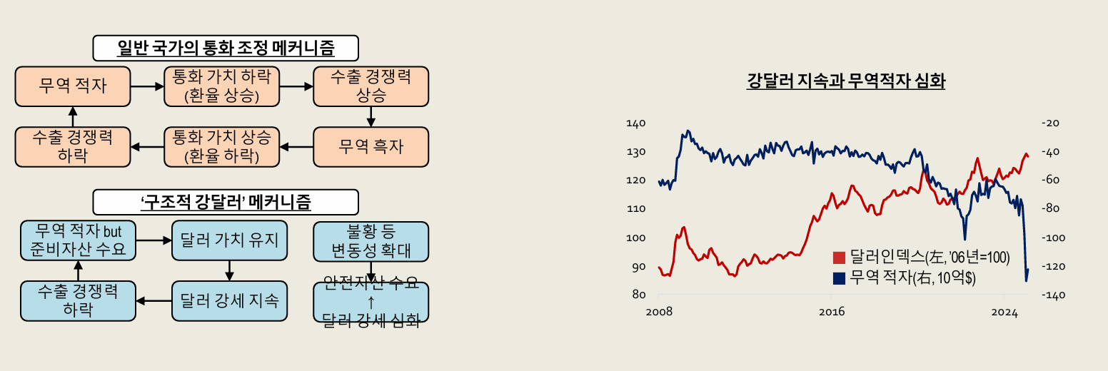 https://www.redtea.kr/free/15882 에 이은 2편입니다. 1편의 댓글에 IEEPA 판결에서 행정부가 패소할 경우 관세환급 등의 문제가 발생할 수 있다는 걸 지적하신 분이 있는데, 트럼프 행정부가 이것에 대해 나름 대책을 세우고 있는 것 같긴 합니다만, 그걸 지금 말씀드리기보다 제가 금요일에 참석하는 무역협회 세미나에 관련 내용이 다뤄지는데, 그걸 듣고 와서 보론 형식으로 댓글이나 다른 글로 쓰는 게 좋을 것 같습니다. 하여튼...2편은 쓰다보니 길어져서 다시 상/하로 나눕니다. ----------------------------------------------------------------------------------------------------- 2편 <두 개의 보고서와 미국의 새판짜기>(상) 1. 관세 정책 드라이브의 근간: 마이런 보고서 길게 느껴지셨겠지만, 아직 트럼프는 당선된 지 1년이 좀 넘었고, 집권해서 실제 행정부가 들어선지는 1년이 채 되지 않았습니다. 약 1년 전으로 돌아가봅시다. 트럼프는 집권 2기 자신의 과제로 1)무역불균형 해소 2)재정문제해결(재정적자 및 국가 부채) 3)제조업 부흥 및 일자리 창출 4)유일 패권 지위 유지((군사력 및 달러)를 제시했습니다. 여기에서 문제가 생깁니다. 모순된 정책이 등장할 수밖에 없다는 겁니다. 예를 들어, 기축통화로서의 달러 패권을 유지하려는 시도는 달러 강세를 만들어내고, 이는 제조업 부흥을 제약하는 요소가 됩니다. 지금 미국의 여러 정책이 갈팡질팡하는 모습이 나타나는 것처럼 보인다면 기분탓...아니 바로 이런 탓입니다. 여기에 한 보고서가 나름 꾸역꾸역 논리를 만들어 이를 해결할 방안을 던집니다. 작년 가을 미 대선 전에 나온건데, 스티븐 마이런 경제자문위원회 위원장이 민간 연구소에 재직하던 시절 쓴 '마이런 보고서'입니다. 원제는 "A User's Guide to Restructuring the Global Trading System"(글로벌 통상 시스템 재구조화를 위한 사용자 가이드). 일단 여기에서 마이런은 '미국이 제공하는 안보-경제 질서에 대한 타국의 무임승차'를 문제시 합니다. 이건 이 글의 후반부(하편)에서 다루게 될 NSS(국가안보전략)보고서의 내용과도 연결됩니다. 하여튼 마이런은 국제통상/안보 질서 유지를 위한 비용(상호관세 수용, 시장개방, 방위비 분담 증액, 미국내 투자, 미국 국채 구매)을 지불하는 국가에 한해서만, 미국이 구축하는 신안보-경제실저의 혜택을 줘야한다는 주장을 합니다. 특히 달러와 관련해 '달러가 세계 질서의 공공재 기능을 하고 있으며, 미국이 처한 무역 불균형의 핵심이 바로 '기축통화' 지위에서 오는 구조적 강달러라고 말합니다. 이 '공공재'라는 인식은 이런 겁니다. 달러가 미국 패권 지위 공고화뿐 아니라 모든 나라가 신뢰할 수 있는 통화로 기능해 글로벌 번영에 기여하는 '공공재 역할'을 수행했다는 것이지요. 마치 미국의 막강한 군사력이 억지력으로 작용해 세계 평화에 기여했다는 것과 같은 논리입니다. (근데 사실 이거 니들이 원해서 페트로달러니 뭐니...무기 팔기 위해 안보는 내가 책임질게 어쩌고 한거 아님?) 기축통화인 달러는 무역적자에도 '준비 자산'으로서의 수요가 발생하고 가치를 유지하게 되는데, 세계적인 불황 등으로 '안전자산' 선호도가 높아지면 역설적으로 강세가 심화되는 것이죠. 여기에서 마이런은 오래된 개념 중 하나인 '트리핀 딜레마'를 가져옵니다. 세계 경제를 위해 달러를 충분히 공급해야 하는데, 미국이 끊임없이 물건을 수입하고 달러를 해외로 내보내야 하기에 만성적인 경상수지 적자를 감수해야 합니다. 그런데, 미구그이 적자가 계속 누적돼 시중에 달러가 너무 많아지면 달러의 가치는 떨어지고 미국의 상환 능력에 대한 의심이 생깁니다. 기축통화로서의 신뢰를 유지하려면 적자를 줄이고 흑자를 내야 하는데, 그러면 전 세계에 달러가 부족해져서 세계경제가 위축되지요. 이러한 '양립 불가능'이라는 트리핀 딜레마에 빗대어, 지금 달러가 처한 환경을 '트리핀 세계'라고 마이런은 지칭 합니다. (그림 참고) 강달러 지속으로 미국은 외국에 있는 달러에 대한(국채) 이자 부담이 커질 뿐 아니라 수출 경쟁력 저하, 제조업 약화, 무역적자 및 정부 부채 누적 등의 부작용에 직면한다는 겁니다. (근데 왜 지금도 계속 강달러냐? 이걸 어떻게 해소하느냐는 뒤에...) 그래서 기본적인 마이런의 인식은 미국은 지금까지 세계 평화와 번영을 위해 희생한 반면, 타국은 의무 없이 권리만 누렸다는 것입니다. 앞으로 신안보/무역질서의 수혜자가 되고 싶은 국가는 그 비용을 지불할 필요가 있다는 게 핵심입니다. 트럼프 1기 행정부는 무역(관세), 안보(방위비)를 분리해서 접근했던 반면에 마이런은 '무역-안보 불가분성'을 주장합니다. 안보 비용을 무역 협상으로도 받겠다는 겁니다. 그러면 지금 2기 행정부의, 올 한해 펼친 관세 정책과 무역 협상이 어느 정도 이해가 됩니다. 그리고 여기에 재미있는 아이디어 하나를 더하는데요, 바로 안보질서와 강대국 지위 유지를 위해 달러의 기축 통화 지위는 유지하되, '달러 보유에 대한 비용'을 청구 해 그 부담을 덜겠다는 겁니다. 이걸 좀 더 풀어서 설명해보면, 당장에는 관세로 인한 여러 부작용을 줄이기 위해 강달러 기조를 가져가지만 장기적으로는 달러약