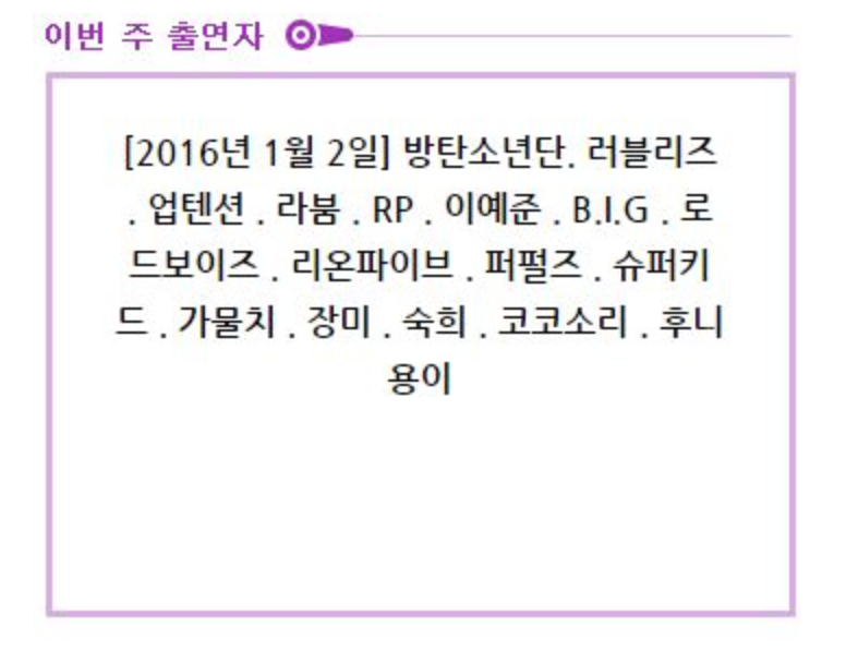 가수들이 연말 콘서트다, 시상식이다 뭐다 하면서... 연말에 신곡을 다 안내고 열심히 콘서트를 비롯해서 이런저런 활동을 한 결과.... 금주에 방송되는 음악중심의 가수 출연 명단이............. 역대급으로 손꼽힐만한 라인업이 탄생했네요.. 급있는 가수들은 죄다 연말엔 콘서트(한국이던 외국이던)를 하다보니.. 곡을 지금 내고 활동할리가 없고... 그 결과가 이렇게.. 어떤면에선 진정한 빈집 타이밍이 아닌가.. 0