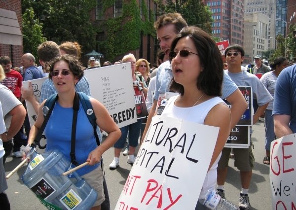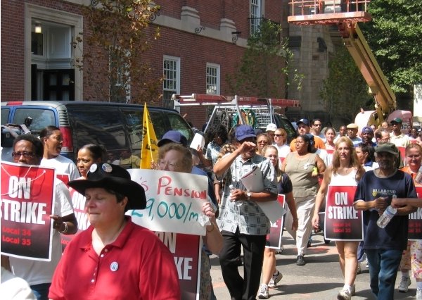 ------- 미국에 도착하고 한 달 정도 지난 후 였습니다. 아직 학기는 시작하지 않았지만, 남의 나라에와서 생존에 필요한것들을 배우느라고 바쁜 시간을 보내고 있었습니다. 그러던 어느 날, 학교 아파트에 살고 있던 집 문을 누가 두드리더군요. 나가봤더니, 인문계쪽 박사과정 학생 두 명이 소개를 하면서 시간이 있으면 이야기를 좀 했으면 한다고 했습니다. 그래서 밖으로 나가서 잠깐 이야기를 시작했는데, 그들은 대학원생들 단체인 Graduate Employees and Students Organization (GESO)이라는 단체의 회원이었습니다. 잠깐 이야기를 하다보니, 이 학생들은 학교내 대학원생들 조직을 노조로 인정을 받으려고 하는 단체라는것을 알게 되었습니다. 이야기를 마치고나서 그 학생들이 조직에 가입할 의향이 있냐고 물어서, 개인적으로 대학원생의 노조화에 동의하는 입장이었기때문에 가입하겠다고 했습니다. 당시 제가 다니던 학교에는 GESO라는 조직말고 Graduate Students Association (GSA)라는 조직이 있었습니다. GSA는 학생회로 노조화에는 특별한 방점을 두지 않는 대학원생들 단체였습니다. GESO는 대학원생이라 하더라도 TA나 RA등을 하면서 급료를 받는 경우에는 노동자라는 개념을 적용해서 노조를 조직하고 단체 교섭권을 획득해야 한다는 생각을 가지고 있었고, GSA는 대학원생이 비록 급료를 받는다고 하더라고 학생이기때문에 노조를 조직할 권리는 가지고 있지 않다라는 입장을 취하고 있었습니다. 학생들 입장은 대체로 반반 정도로 갈라져 있었던 것으로 기억하고 있습니다. 미국에서 대학원생 노조조직화에 대한 시도는 1950년대부터 시작되었는데, 공립학교와 사립학교는 서로 다른 법의 적용을 받습니다. 공립학교의 경우에 대부분의 주에서는 대학원생이 TA나 RA를 하면 그 주의 공무원과 유사한 대우를 해 주는 경우들이 많습니다. 연방법인 Taft-Hartley Act에 의해서 학생들은 주정부나 지방정부의 공무원들 중에서 단체교섭권을 가질수 있는 그룹에서 제외되어 있습니다, 그렇지만, 일부 주에서는 주의 법에 학생들에게는 단체교섭권을 주지 않는다고 명시적으로 되어 있지 않다보니, 노조 조직을 위한 캠페인 후에 일부 주립대학들의 대학원생들은 노조를 조직하고 단체 교섭권을 가진 학교들이 있습니다. 사립대학의 경우에는 학생들의 노조화는 전국노사관계법 (National Labor Relation Act)에 의해서 결정이 되는데, 이것을 관할하는 기관인 National Labor Relation Board에서 최종 결정을 내립니다. 6-70년대 대학원생들 노조화를 위한 노력이 꽤 있다가, 80년대 레이건 시절에 그 시도는 주춤해졌습니다. 그러다가 90년대가 들어서면서 다시 대학원생들 사이에서 대학원생 조직의 노조화에 대한 시도가 상당히 공격적으로 이루어지고, 1995년에는 AFL-CIO에서 학생노동조합건설을 위한 프로그램을 여름에 운영을 해서, 학생들에게 노동조합 결성을 위한 각종 실무적인 지식을 전달해주었고, 이 후 2000년을 전후해서는 NYU, Temple University, Michigan State University등에서 대학원생들 노조를 인정받기에 이르르게 됩니다. 제가 있던 학교도 대학원생 노조창립을 위한 운동이 굉장히 공격적으로 이루어지던 곳이었습니다. 당시 GESO에서 활동하던 학생들은 일단 멤버쉽을 늘리는것을 가장 중요한 목표중에 하나로 두고 있었고, 다음으로는 학교내 다른 노조들과 공조를 하는것을 중요시하고 있었습니다. 당시 학교내에는 사무직 직원들이 중심이 된 Local 34와 블루 칼라 직원들이 중심이 된 Local 35, 그리고 간호사 노조가 있었는데, Local 34와 Local 35의 경우에 학교와의 계약이 만료가 되어가고 있는데, 학교와 의견이 맞지 않아서 계약이 갱신이 되지 않고 있었습니다. 그래서 제가 2년차를 마쳤을 무렵에 Local 34와 35는 시위 및 파업을 계획을 하고 있었습니다. 여름에 이루어진 이 시위와 파업은 참 평화로운 시위와 파업이었습니다. 일단 학부생들은 방학이어서 학교가 바쁘지 않았기 때문에, Local 34와 35의 경우에도 부담감이 적은 상태로 파업을 할 수 있었습니다. 공조 파업을 한 대학원생들의 경우에도 TA들은 할 일도 따로 없었기 딱히 부담스럽지 않은 상태에서 파업을 했습니다. 아무래도 노조측에서는 학부생들이 있는 동안에 파업을 하는 것에 대해서 조금 부담감을 느껴서 그랬던것 같습니다. 그리고 파업도 장기간 하는건 아니고 하루동안 하는 파업이었고요. 저는 당시 RA였기때문에 지도교수한테 이야기를 했고, 지도교수는 이런 문제에 대해서 이해를 잘 해주는 분이어서, 별 문제없이 참여를 하게 되었습니다. 위에 사진 두 장은 당시에 찍은 사진입니다. 파업이라고 해도, 무척 평화롭게 진행이 되었습니다. 아침에 모이라고 하는 곳에 가서 몇 시까지 도착했다고 이름을 적습니다. 대학원생은 별 문제가 없기는 했는데, Local 34나 35에서 참여하는 사람들은 꼭 해야 하는 과정중에 하나입니다. 그러고는 점심으로 먹을 것 나눠받고는 지정된 곳에 모여서 걸어다니게 됩니다. 당시 AFL-CIO의 회장과 지금은 맛이갔지만 그때만 해도 little king이라고 불리던 Jesse Jackson이 와서 연설도 하고는 시위대와 함께 시내 행진도 같이합니다. 경찰이 하는 일은 시위대