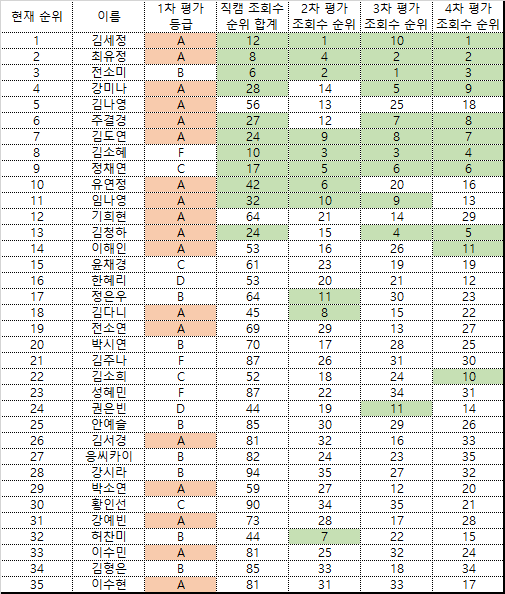 2~4차 평가 직캠 조회수 순위입니다. (현재 생존자 35명 내에서의 순위)