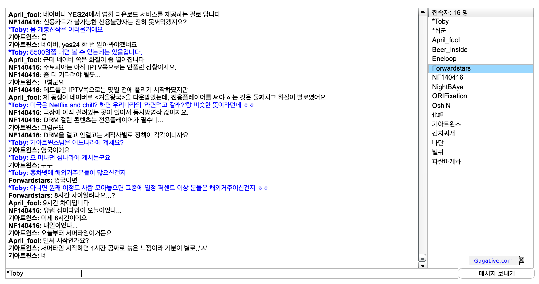시간되시는 분들과 잠깐 채팅을 해볼까 하고 홍차넷 닉네임과 연동되는 채팅방을 만들어봤습니다. 플래시 채팅방이라 모바일이신 분들은 접속이 안되실거구요. 데스크탑 사용자분들만 사용 가능합니다. [채팅 종료] 이 채팅방은 오늘 저녁에 한해서 한시적으로 운영합니다. 0
