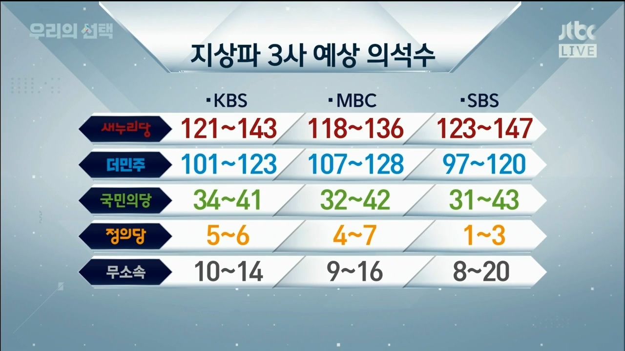 첨부한 사진은 JTBC에서 각 지상파 출구조사를 정리하여 송출한 화면 캡처입니다.