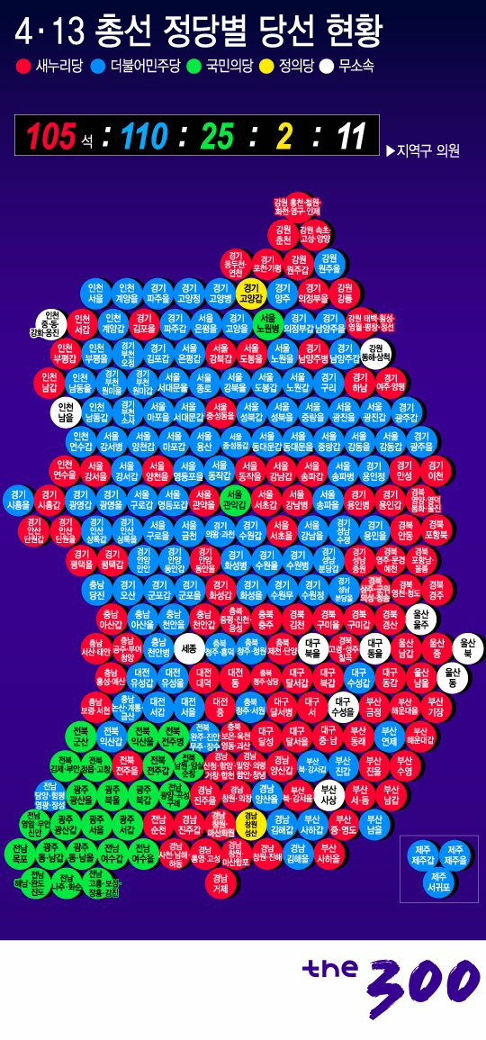 제20대 국회의원 선거 결과, 더불어민주당 123명/새누리당 122명/국민의당 38명/정의당 6명/무소속 11명으로 총 300명이 국회의원에 당선되었습니다.