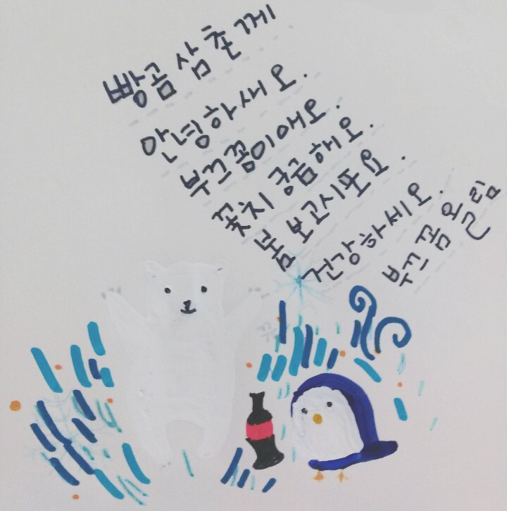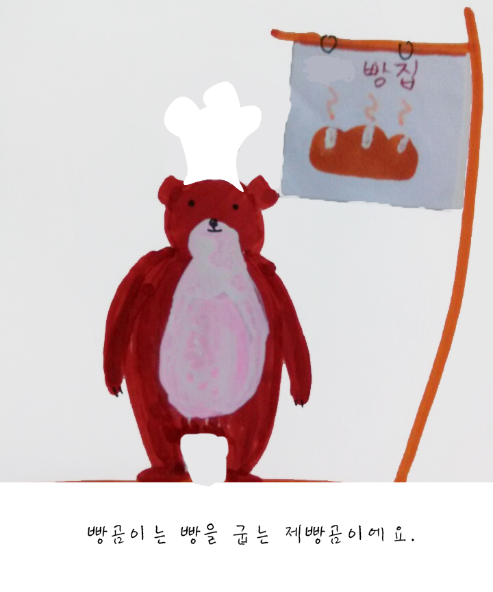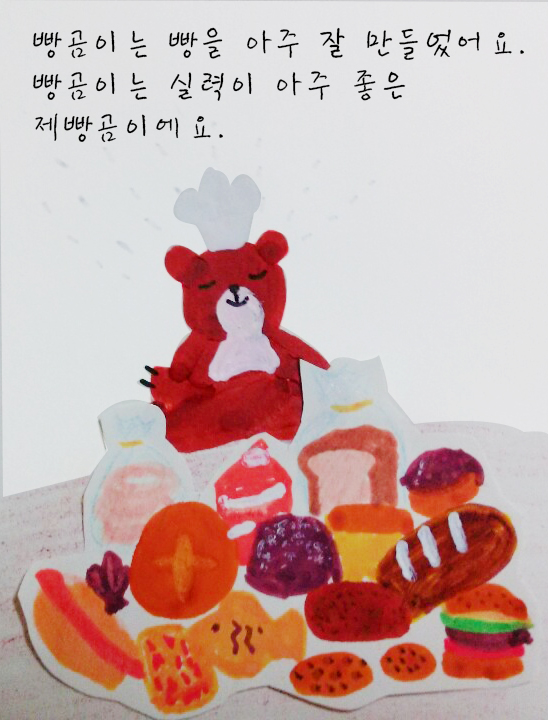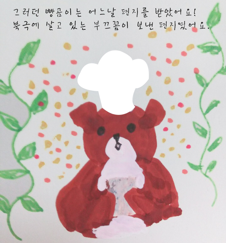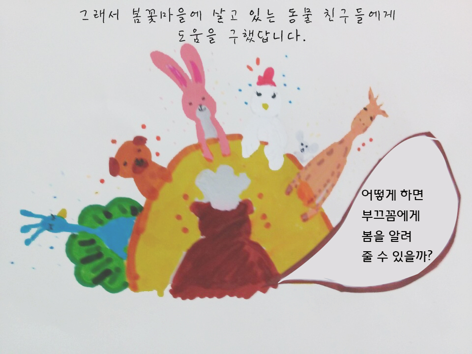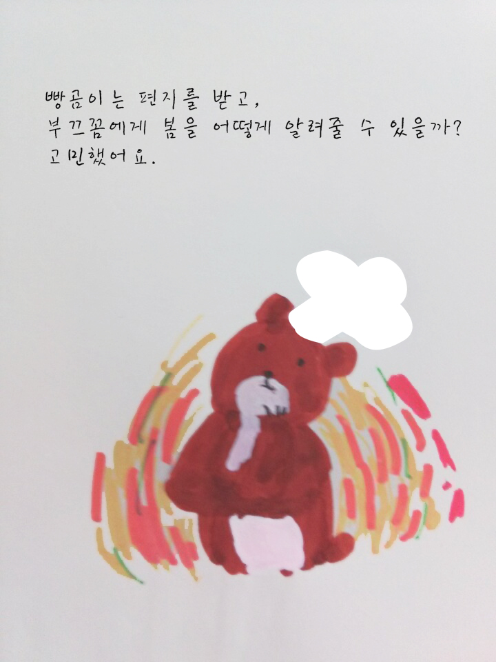 [조각글 22주차 주제] '봄날 풍경'으로 동화나 동시 짓기 *주제 선정자의 말 [시니컬하거나 냉소적이거나 혹은 비판적이거나 하면 안되고 정말 동화나 동시 있죠! 그걸로요 ^.^] - 분량, 장르, 전개 방향 자유입니다. 합평 받고 싶은 부분 읽는 대상이 아이인데, 어휘가 어렵거나 (어려워도 어휘력을 풍부하게 하기 위한 의도를 감안하여) 눈높이에 맞게 설정이 필요할 것 같은데 조언 부탁드립니다. 4~5살 정도의 아이의 인지에 맞(을 것 같다고 생각하면서)게 썼습니다. 동화에 대해 딱히 공부한 것이 아니라 어렵네요ㅠㅠ ㅋㅋㅋㅋㅋㅋㅋㅋㅋㅋㅋㅋㅋ ㅋㅋㅋㅋㅋㅋㅋㅋㅋㅋㅋㅋㅋ ㅋㅋㅋㅋㅋ 동화를 쓰다가.. 괜히 잉여력 돋아서 그림 그려봤는데 중간에 너무 힘들어서 ㅋㅋ 여기까지만 그리고 올려봅니다. 손으로 그리고 휴대폰으로 찍었는데, 화질이 너무 안 좋아서..ㅠㅠ 대충 배경만 밝게 수정하고 대충 올려봅니다..ㅎㅎ..ㅠㅠ 발그림이라도 감안하고 봐주세용 ㅎㅎ 저 다음으로 2편을 이어서 써주셔도 괜찮을 것 같습니다. 본문 ![]() ![]() ![]() 빵곰이는 앙금빵도 만들고, 브라우니도 만들고, 카스텔라도 만들고, 도넛도 만들고, 바게트도 만들고, 크로켓도 만들고, 애플파이도 만들고, 핫도그도 만들고, 햄버거도 만들고, 쿠키도 만들고, 케이크도 만들 수 있어요. 와! 정말 맛있겠죠? ![]() ![]() ![]() ![]() 공작이모와 강아지 삼촌, 토끼 형, 쥐돌이, 닭 아줌마, 기린 아줌마가 부끄꼼에게 보낼 선물을 준비했어요. 빵곰은 도움을 준 친구들에게 빵을 선물해주었어요. 빵곰은 부끄꼼에게 편지와 친구들이 보내준 선물을 보냈어요. 빵곰이 보낸 편지와 선물이 부끄꼼이 살고 있는 북극에 도착했어요. 부끄꼼은 신이 나서 선물을 뜯어보았어요. 부끄꼼은 삼촌이 보내준 편지를 읽을 수 없어 엄마곰에게 읽어달라고 부탁했어요. 글을 읽지 못하는 친구들처럼요. 부끄꼼에게 안녕? 부끄꼼아. 빵곰 삼촌이야. 부끄꼼에게 봄이 어떤지 알려주기 위해 봄꽃 마을 친구들이 선물을 보냈단다. 나는 빵을 선물했단다. 봄은 빵처럼 따듯하고 달콤한 향기가 나거든. 공작 이모는 공작 이모의 깃털을 선물했어. 공작 이모의 화려한 깃털처럼 봄에는 나무와 풀들이 저마다 자신의 아름다움을 뽐내거든! 강아지 삼촌은 네게 공을 선물했어. 공을 가지고 폴짝폴짝 신나게 뛰놀다 보면 봄이 왔을 때 반가운 기분을 알 수 있을 거야. 토끼 형은 네게 당근을 선물했단다. 당근의 향과 아삭한 맛이 봄을 닮았다고 하더구나. 먹으면 눈에도 좋아지고 말이지. 쥐돌이는 네게 클로버를 선물했어. 클로버의 꽃말은 행복이거든. 봄이 되면 들판엔 클로버가 가득해. 봄에는 행복이 가득하다고 전해달라고 하더구나. 기린 아줌마와 닭 아줌마는 네게 나뭇잎으로 만든 스웨터를 선물했단다. 기린 아줌마가 긴 목으로 나뭇잎을 모아주면, 닭 아줌마가 부리로 나뭇잎을 쪼아 스웨터를 만들었단다. 푹신하고 좋은 향이 나고 따듯해서, 봄의 기분을 잔뜩 느낄 수 있을 거라고 했단다. 그리고 우리는 부끄꼼을 봄꽃마을에 초대하기로 했단다. 엄마 아빠의 허락을 받고 언제든지 놀러 오렴! 기다리고 있을게. - 빵곰삼촌이. 편지를 읽은 부끄곰은 엄마곰과 아빠곰도 허락을 받아 봄꽃마을에 놀러 가기로 했어요. 부끄꼼은 봄꽃마을은 어떤 곳일까 궁금하여 잠을 이룰 수 없었어요. 겨우 잠들은 부끄꼼은 그날 밤 꿈속에서 봄꽃마을에 놀러 가는 꿈을 꾸었어요. 우리도 봄꽃마을로 놀러 가 볼까요? -다음 권 계속- 5
