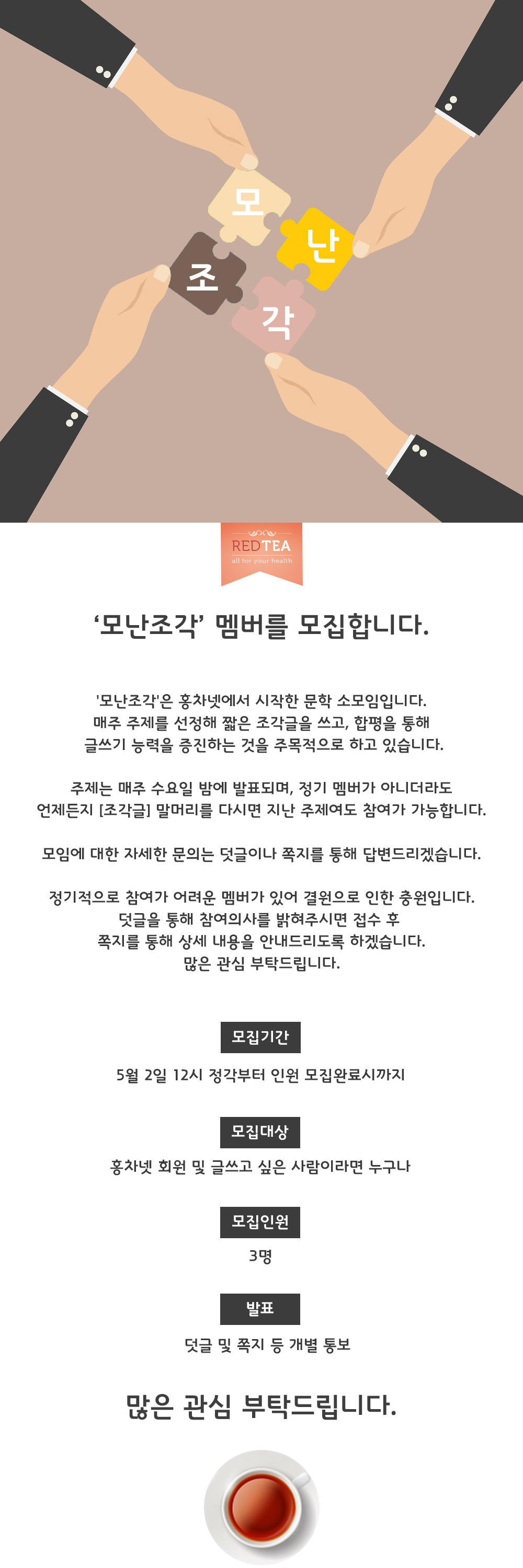 | Subject | [마감완료] 조각글에 참여하실 멤버를 찾습니다! |