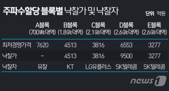 A - 아무도 입찰 안해서 끝 B - KT 처음 입찰가에서 아무도 추가 입찰 안해서 KT 최저가 획득 C - LGU 처음 입찰가에서 아무도 추가 입찰 안해서 LGU 최저가 획득 E - SKT 처음 입찰가에서 아무도 추가 입찰 안해서 SKT 최저가 획득 ?!?!?!?!?!? 누가 봐도 견적이 딱 나오는 결과네요... D블록만 경쟁이 쫌 붙어서 투닥투닥 하다가 SKT가 획득하고 나머지는 위와 같이 아주 평화롭게.. '무려 비공개 입찰' 이였음에도 불구하고 사이좋게 하나씩 최저가 입찰후 추가입찰 없이 마무리 되는 훈훈한 그림이 나왔습니다. 정말 우연히 통신사 3개가 서로 원하는 주파수가 달랐고.. 과열경쟁 없이 순수하게 본인이 가지고 싶은 주파수만 베팅하고 끝이 난거라고 믿어봅니다. p.s 살짝 덧붙이자면.. 통신사마다 원하는 주파수대가 사실 정해져 있긴 하고.. 다른 주파수를 먹으면 부대비용이 더 들기 때문에 기피하긴 합니다만 과거까지는 서로 태클을 걸고 베팅을 해서 일정 수치까진 올린 후 먹었습니다만.. 이젠 노골적으로 한큐에 먹게 되었다는게 차이라고 보시면 될것 같네요. 0