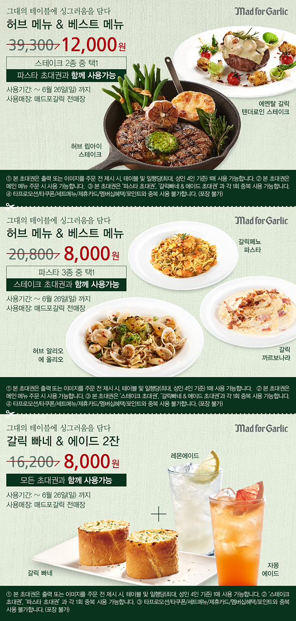 http://cdn.madforgarlic.com/event/160609/print_160609_m.html 자세히 보시면... 사용횟수 제한도 없고 중복 사용도 가능합니다. 여럿이서 가면 싼값에 다양한 메뉴를 즐길 수 있겠네요. 다만 이벤트 기간이니 예약이 어렵고 대기가 많지 않을까 예상됩니다. 0
