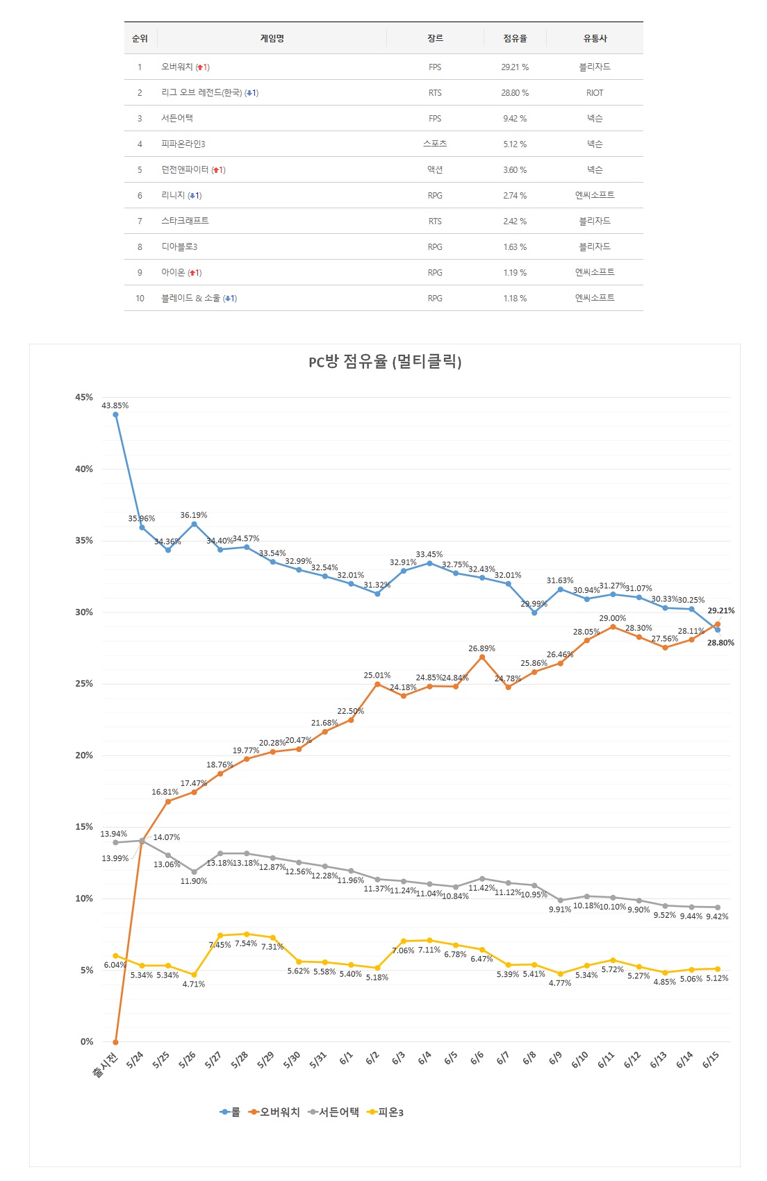 PC방 점유율에서 항상 1위를 하던 리그 오브 레전드가 203주만에 2위로 내려갔습니다