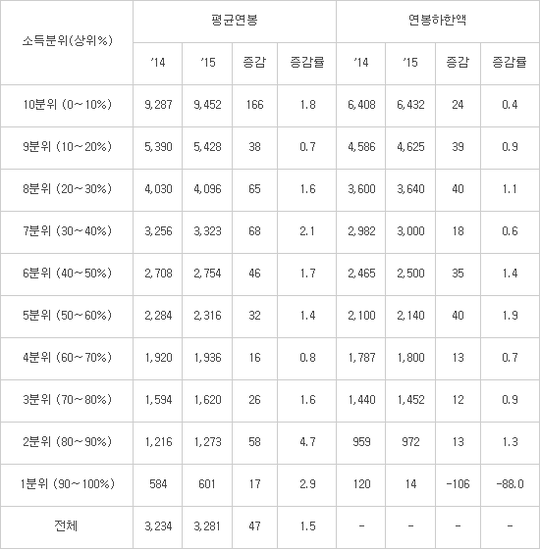 조건의 경우 근로자의 세전 연봉 입니다. (성과급등 다 포함) 2015년에서 최하분위의 경우, 140만원을 14만원으로 오타내서 공개한거 아닐까 싶은 수치네요 -.-;; 작년하고 비교해보면.. 자료 제공은 고용노동부에서 공개한 자료인 만큼.. 큰 오차는 없지 않을까 싶네요.. (근로자 기준이라.. 자영업자, 고용주, 금융소득등은 빠져있습니다.) 추가로 인원별로는 아래와 같습니다. 연봉이 ‘1억원 이상’인 근로자는 39만명(2.7%) ‘1억원 미만∼8000만원’은 41만명(2.8%) ‘8000만원 미만∼6000만원’은 96만명(6.5%) ‘6000만원 미만∼4000만원’은 203만명(13.8%) ‘4000만원 미만∼2000만원’은 554만명(37.7%) ‘2000만원 미만’은 535만명(36.5%) 번외로는 대기업 정규직 평균은 6544만원 중소기업 정규직 평균은 3363만원 이라고 하네요.. 이런 지표를 볼때마다 양극화가 갈수록 정말 심해지고 있구나 하는 생각이.... (평균은 3281만원이지만, 중위값은 2500만원이라는 점에서....) 평균 연봉 인상률은 14년->15년이 되면서 40만원 올랐다고 합니다.. (1.2%) 관련뉴스 : http://news.jtbc.joins.com/html/167/NB11276167.html 0