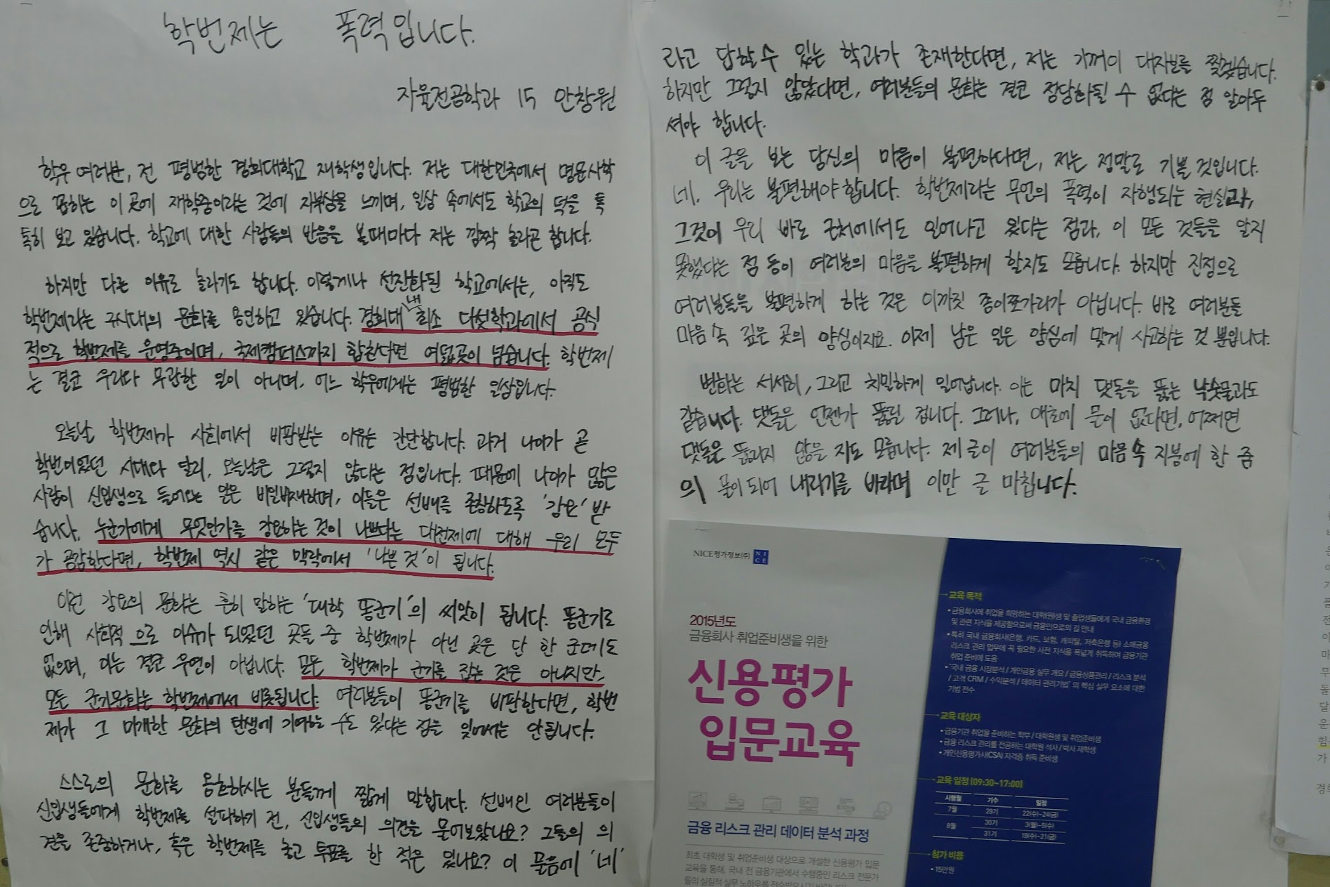 학교내에서 학번제를 겪은 적도 없어서 관련한 글을 a4용지로 뽑아서 옆에 붙였습니다.
