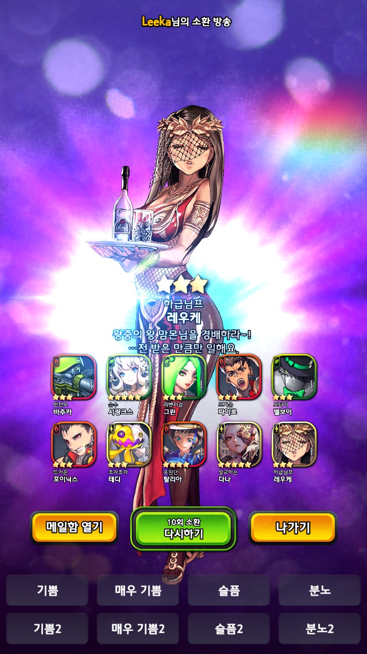 10연가챠 한방에 5성 2개 + 4성 1개를 먹고 뿌듯해서 찍은 캡쳐...