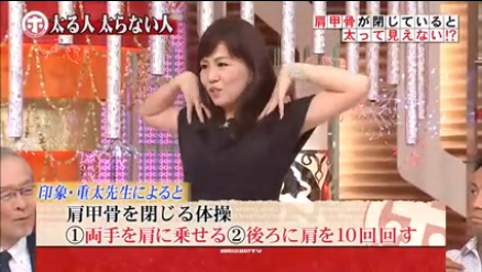 일본 후지 테레비에서 방송하는 교양 예능 프로 '혼마뎃카!?TV'의 10월 26일 방송 내용입니다. 주제는 '뚱뚱한 사람과 날씬한 사람은 무엇이 다른가?' 입니다. 잘못된 부분이 있으면 가차없이 지적해 주세요. 전 들린대로 옮기기만 한 거니까요. 1. 초콜렛을 자주 먹는 사람은 살찌지 않는다? 미국에서 20세-80세 약 1000명 대상 조사. 초콜렛의 종류, 섭취량은 무시하고 먹는 횟수만 가지고 체크해 본 결과 초콜렛을 자주 먹는 사람이 안 먹는 사람에 비해 날씬했다. 이유는 초콜렛에 대사를 활발하게 하는 물질이 들어있기 때문으로 추정됨. 그 외에도 초콜렛을 먹으면 수명도 늘고 뇌출혈도 줄어든다고 함. 2. 머리가 좋음(기준은 IQ인 듯) -> 머리를 많이 씀 -> 에너지 소모 -> 날씬함 반면에 뚱뚱한 사람은 IQ가 낮은 경향이 있다. 3. 비만과 관련된 유전자가 몇 가지 밝혀져 있고, 그 중에 FTO라는 유전자가 가장 비만과 관련성이 높은데 이 유전자를 가지고 있는 것 자체만으로 늘어나는 체중은 1KG뿐. 생활 습관 및 환경에 따라 유전자가 ON/OFF하고, ON상태가 되면 비만이 되는 것임. 연관된 이야기로, 아버지가 기아 상태가 되면 정자 내 유전자의 ON/OFF 상태가 여러가지 바뀌게 되는데 정자와 난자가 수정이 되면 보통은 모든 유전자의 스위치가 초기화 되지만 아버지가 기아 상태라는 스위치는 수정이 되어도 초기화 되지 않고 아이에게 전달된다. 그러면 아이는 몸에 에너지를 저장하는 체질이 되어 비만이 됨. (뭔 소린지 100% 이해가 되진 않지만 아무튼 전 들은 그대로 적은 겁니다) 4. 비만인 사람에게 비만은 병이라고 하면 더 살찐다. 2013년 여름에 미국 의사회에서 비만은 병이다 라고 발표함. 환자들이 심각함을 인식하고 생활습관을 바꾸게 하려는 의도. 이후 리치몬드 대학에서 700명 정도 조사. 세 그룹으로 나누어, 비만은 병이라는 논문/비만은 병이 아니라는 논문/중립적 논문 을 읽게 하면서 음식을 제공하는 실험을 했는데 비만인 사람 중에 비만은 병이라는 논문을 읽은 사람만 음식을 마구 먹었다. 병이라면 어쩔 수 없지 하는 심리. 4-1. 10세 여성에게, 실제로는 뚱뚱하든 날씬하든 관계없이 부모가 '너 뚱뚱해'라고 하면 19세 시점에 뚱뚱해져 있을 확률이 1.66배. 4-2. (비만과는 좀 관계 없는 이야기) 언어교육학에서도 어머니가 부정적인 말을 먼저 하면 아이가 진짜로 그렇게 된다고 함. 예를들어 '너 굼뜨다. 빨리빨리 행동해라' 라고 하면 굼뜨다는 앞부분만 받아들이고 뒷부분까지는 이해를 못 한다고. 아이들에게는 긍정적인 말을 먼저 해야 한다. 5. 질긴 음식을 먹는 것이 유리하다. 먹기 시작한 후 배부름을 느끼는 데 까지 30분 걸리므로 오래 씹어서 천천히 먹어야 함. 또한 씹는 횟수 자체도 배부름을 느끼는 데 영향을 미침. 6. 운동 30분 전에 카페인을 섭취하면 지방연소효과 20-50% 상승. (카페인이 살 빼는데 좋았으면 좋았지 나쁘지는 않은 듯? 참고 자료 http://blog.naver.com/kiltie999/70042247156 ) 7. 요세관으로 지나가는 소변에 포함되어있는 당을 모세혈관에서 혈액으로 재흡수하게 되어 있는데 이것을 방해하는 타입의 당뇨병 약이 최근 미국에서 개발되었음. 당을 그대로 소변으로 배출하게 되는 것이므로 좀 더 발전시키면 자동으로 살이 빠지는 다이어트 약이 만들어질 수도. 8. 같은 양을 먹어도 조금씩 자주 먹는 것보다 한 번에 왕창 먹는 게 살이 덜 찐다. 미국 2만명 데이터를 일본영국팀이 분석한 결과인데 1일 5회 이상 먹는 사람은 1일 2회 이하 먹는 사람 보다 상당히 뚱뚱했음. 이유는 조금씩 먹으면 100% 흡수되지만 한 번에 왕창 먹으면 흡수되지 않고 배설되는 양이 있기 때문. 9. 자세가 바르면 날씬해지는 데 유리함. 바른 자세 = 근육 동원 = 에너지 소모이기 때문. 10. 같은 체중이라도 견갑골이 조여져 있으면 더 날씬해 보임. 뒷모습만 보여주고 체중을 예상하게 한 결과 견갑골이 조여진 쪽이 예상 체중이 낮았음. (첫 번째 사진의 왼쪽) 그러기 위해서 어깨를 펴는 스트레칭 방법 : 손을 어깨에 놓은 채로 팔 전체를 돌린다. 팔꿈치가 뒤로 갔을 때 견갑골이 튀어나와야 함. 10번. 반대방향으로 돌린다. 역시 10번. 이걸 하루 세 번. (자세는 두 번째 사진 참조) 11. 같은 체중이라도 굴곡이 있으면 더 날씬해 보임. 어깨 팔 등의 근육이나 잘록한 허리. 배를 홀쭉하게 한 상태에서 허리를 비틀어주면 허리를 날씬하게 잡아주는 근육이 단련된다. . 방송 후반부에는 최신 암 치료법에 대한 이야기가 나왔는데 혈액 한 방울로 대장암을 발견하는 기술이 2017년 실용화 예정이라고 합니다. 10000-15000엔 정도 할 거라고. 저는 '이제는 그 무시무시한 대장내시경을 안 해도 되는 건가?' 기대하며 이미 김칫국을 한 사발 시원하게 들이킨 상태입니다. 의료 관계자 님들.. 넌 다시는 쿨프렙을 안 먹어도 된다고 누가 좀 말해줘요 제발.. 0