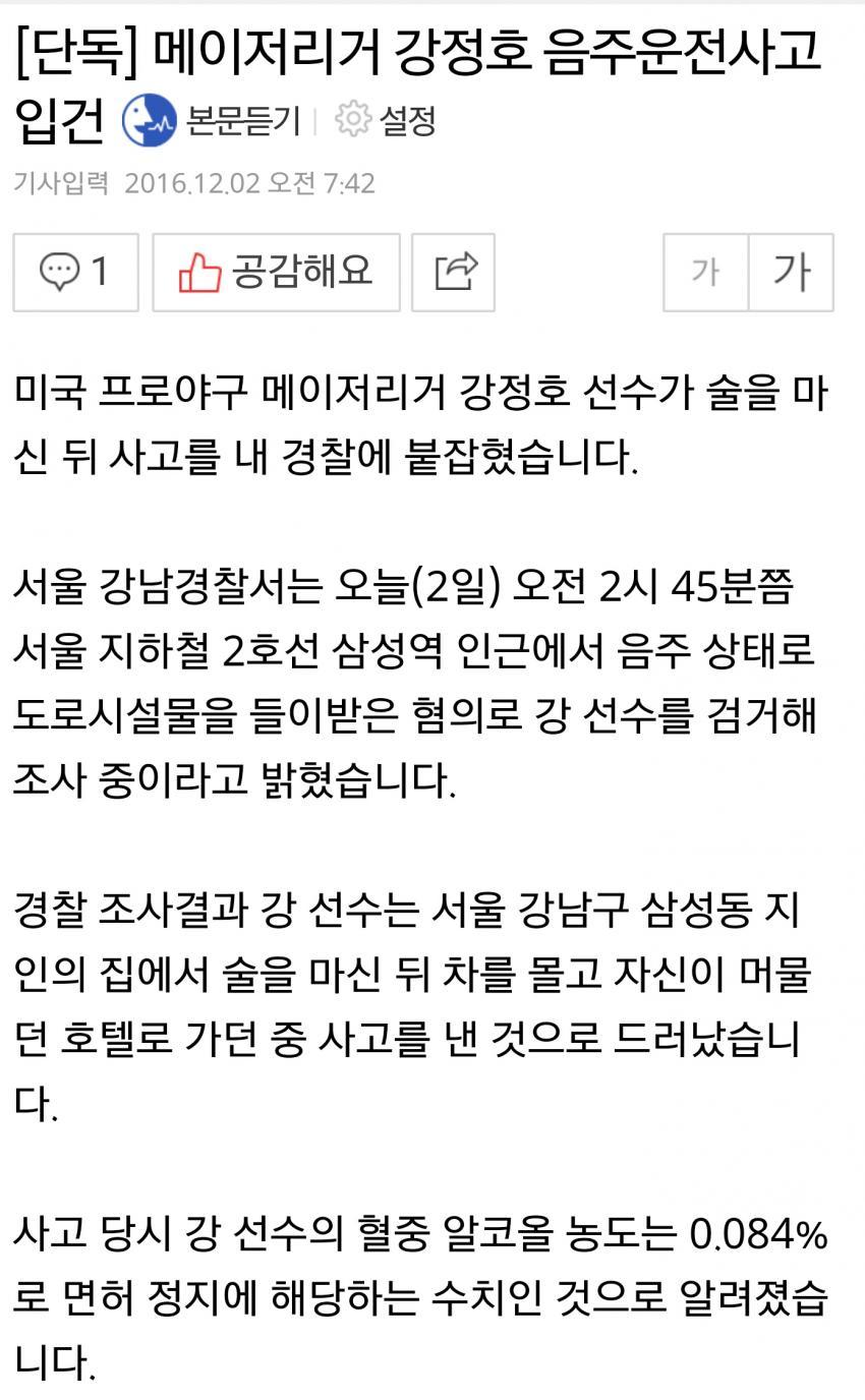 안녕하세요 김치찌개입니다! 강정호선수 음주운전으로 입건했네요;; 기사에 따르면 오늘 새벽 2시 45분 지하철 2호선 삼성역 인근에서 음주상태로 도로 시설물을 들이받았다고 하는군요 자신의 차를 몰고 호텔로 가던중 사고가 났고 알코올 농도고 0.084%였으면 면허정지수준인데요 올해 성폭행도 연루되고 이제 음주운전까지.. 참 다사다난하네요 안타깝네요 공인인데 말이죠 음주운전사고를 보니 추신수선수가 떠오르네요 음주운전은 정말 위험합니다 정말로요 음주운전 사고 현장 사진도 첨부해서 올려봅니다 아주 제대로 들이받은거 같은데요 즐거운 하루 되세요.. 출처:MLBPARK 0