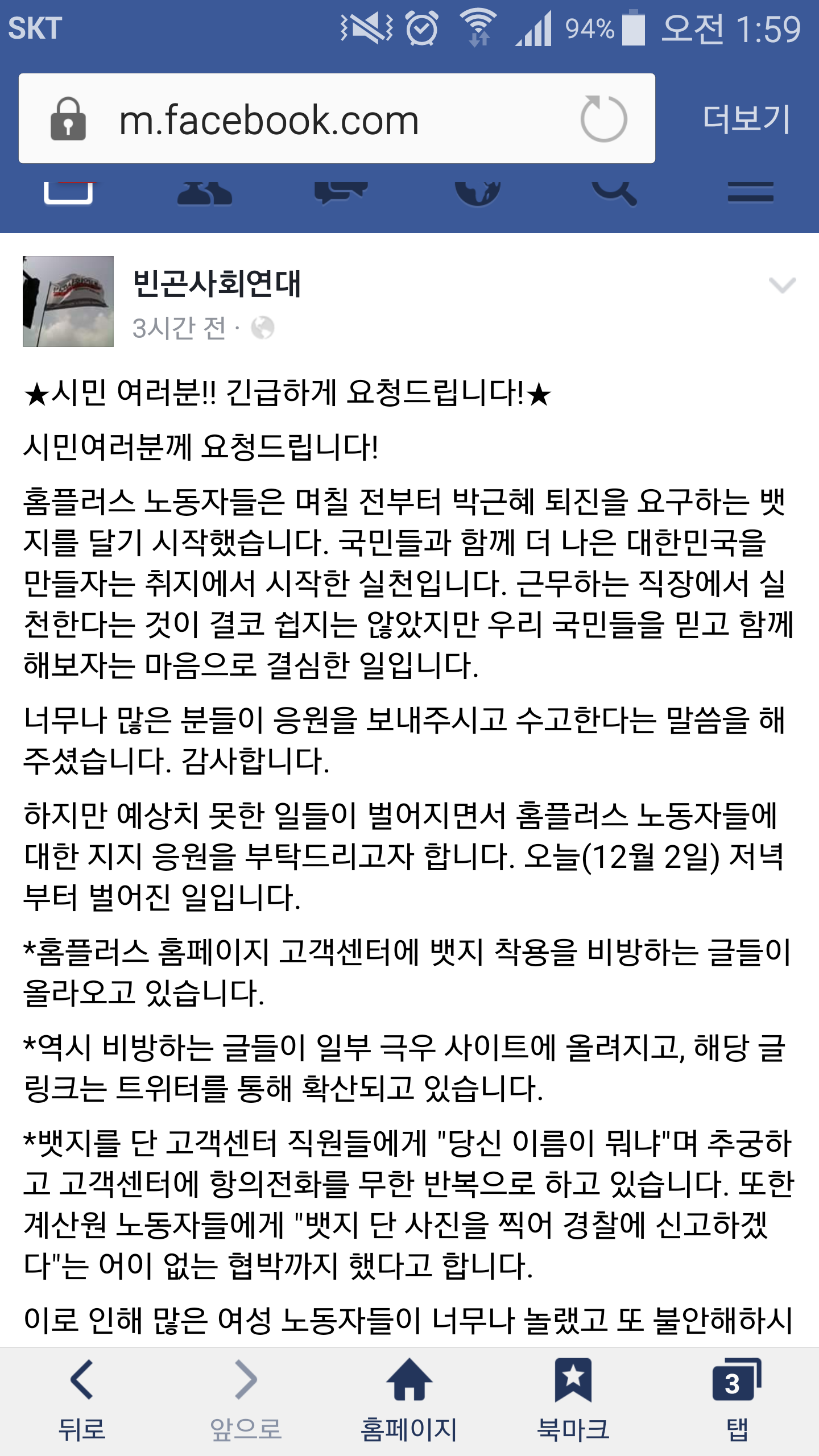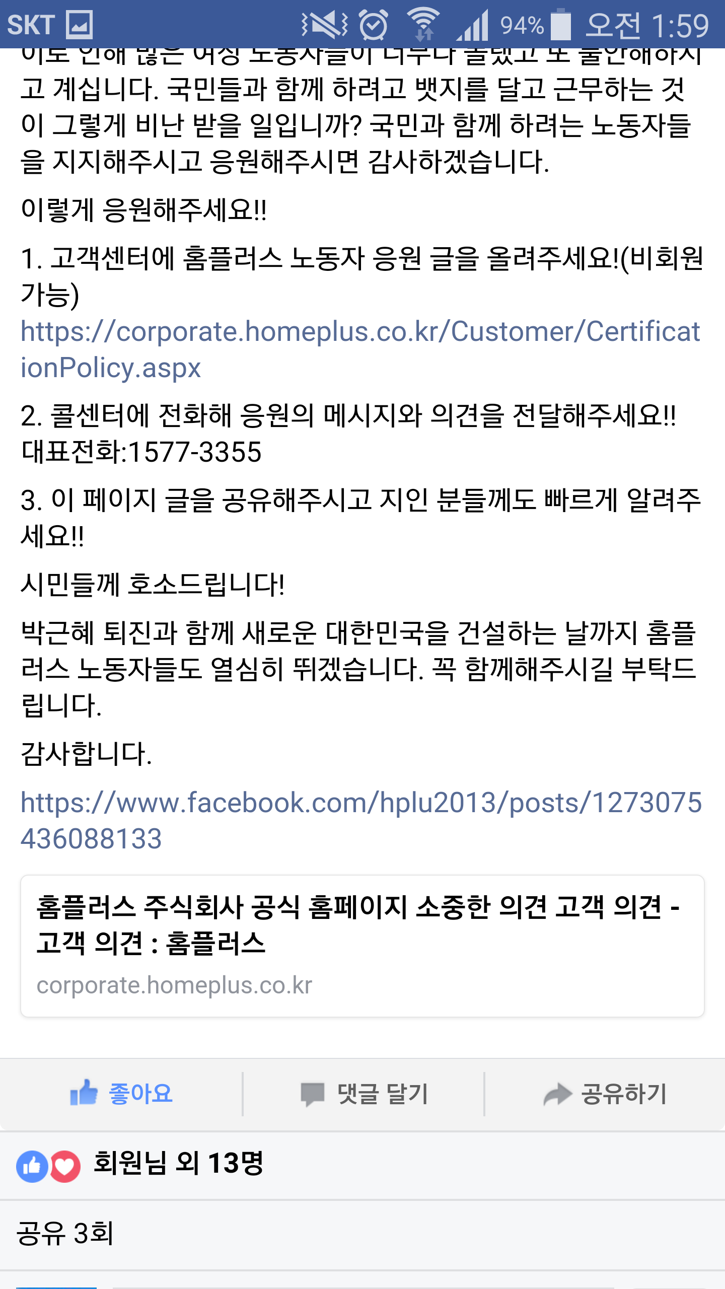 많이 퍼뜨려주셨으면 좋겠습니다. 가장 기본적이고 당당해야할 권리를 겁박하는 사람들에 함께 맞서기위해 홈플러스 노동자들을 지지합니다.
