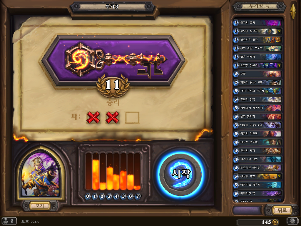 나머지 1경기는 천상의보호막부여카드를 잔뜩 들고온 성기사에게 두들겨 맞았습니다. 이제 성기사 상대할 때도 마법사 상대할 때처럼 7코스트에 정말 긴장타야해요. 이 성기사한테 지고 다음판에 또 만났는데 그 때는 이겼습니다. well met.