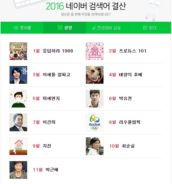 1월부터 11월까지 전부 아.. 그럴만하다 라는 생각이 바로 드는 검색어 순위네요 -.-; 신드롬을 열었던 응팔과 태후 성매매로 이슈가 된 박유천과 이건희 자연이 불러온 이슈인 미세먼지와 지진 인간과 기계의 대결인 이세돌과 알파고 걸그룹계를 뒤흔든 프로듀스 101 세계인의 축제 올림픽 그리고 다시는 나와서는 안될 최순실과 박근혜까지.. 내년에는 올림픽 이후 검색어들은 순위에서 볼일이 없었으면 좋겠다는 생각도 드네요. 0