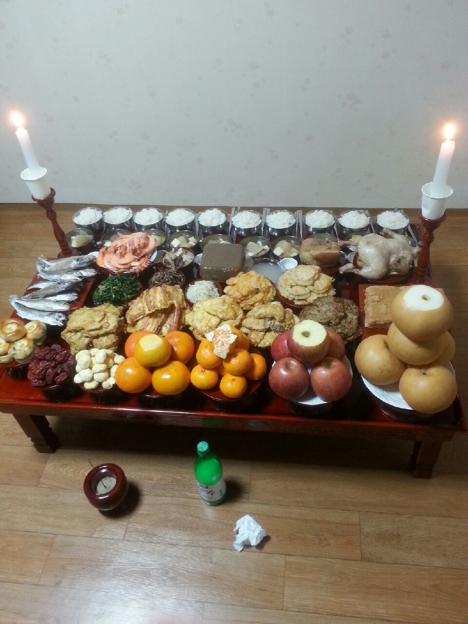 1년에 4번이며 기제사랑 봉제사? 추석, 설날 지냅니다. 열명이 넘는 친척들이 오는지라 음식을 많이 할 수 밖에 없지만 요즘도 이렇게 상다리가 휘어지도록 상을 차리는가 싶습니다. 푸짐하면서 좀 난잡한 느낌이랄까..저기 차려져 있는 음식들을 빼고도 전이며 나물, 새우, 과일 등은 잔뜩 있습니다. ㅠㅠ 다른집은 어떨까 싶어 올렸습니다. 0