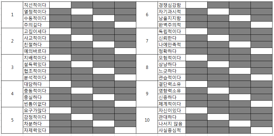 이 리스트를 체크하는 방법은 각 번호당 4개의 형용사가 있는데 그 중 자신과 가장 잘 어울리는 단어에 5점, 자신과 가장 맞지 않는 단어에 1점, 그 외 2개 중에서 4점과 2점을 주면 됩니다. 3점은 없으니 주의하세요.