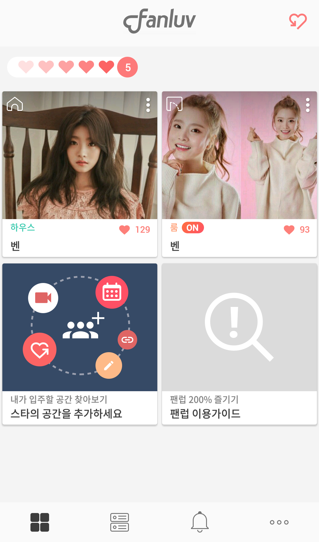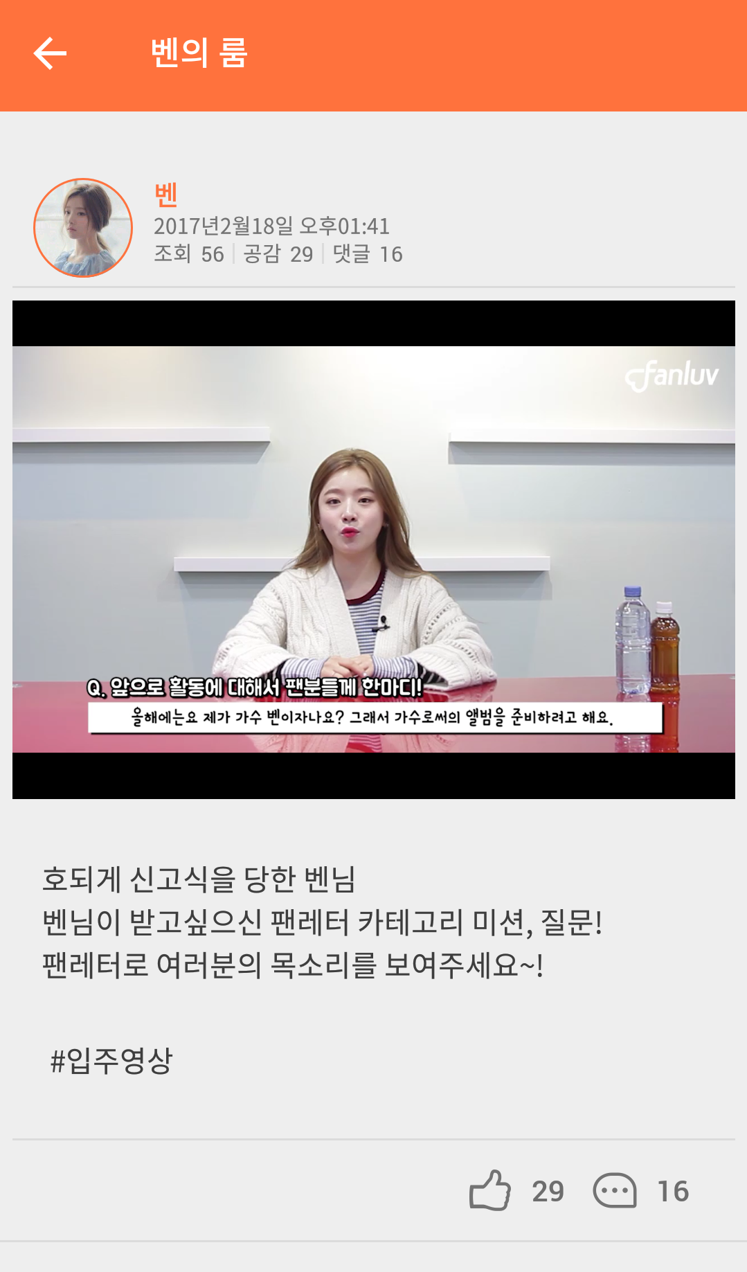 어..크크 저는 이 앱을 만든 회사?랑 전혀 무관한 사람이구요 크크 관계자 아니에용 단지 이 앱이 흥미를 끌만한 요소가 있어서 이렇게 이 앱을 소개합니다. 팬럽(fanluv)이라는 스마트폰 앱이 있어요. 안드로이드용입니다. 여기에서 스타와 팬이 소통을 할 수가 있어요. 이 앱에는 하우스(House)라는 곳이 있고, 룸(Room)이라는 곳이 있어요. 하우스는 팬들끼리 소통하는 공간이고(팬카페 같은), 룸은 팬이 스타에게 팬레터를 작성해 드리고 또 스타는 팬에게 러브레터를 작성해 주는 곳이래요(온라인 형식의 러브레터?). 뭐 오늘 저도 처음 알았는데 제가 제일 좋아하는 연예인인 벤양이랑 소통을 할 수 있다니 기쁘네요 크크 (그런데 어차피 팬카페가 원래 있었다는 건 함정) 벤양의 Room으로 가시면 벤양의 귀여운 입주영상 있는데 한번 보세용~♡ 아, 아까 벤양 팬카페의 어떤 분께서 직접 영상을 편집해서 올려주셨어용~! 그분의 허락을 받고 여기에다가도 링크 겁니닷 출처 : 팬럽fanluv 앱 이 앱에 현재 입주해있는 스타들은.. 트와이스, 여자친구, 아이유, 아이오아이, 러블리즈, 공유, AOA, 걸스데이 등등이 있는 것 같네요 쭈욱 보니. 스타 1인당 Room이 하나씩 있네요. 트와이스이면 쯔위, 정연, .. 등등 스타 1인당 Room이 1개씩 각각 따로 배정되어 있는 것 같습니다. 0