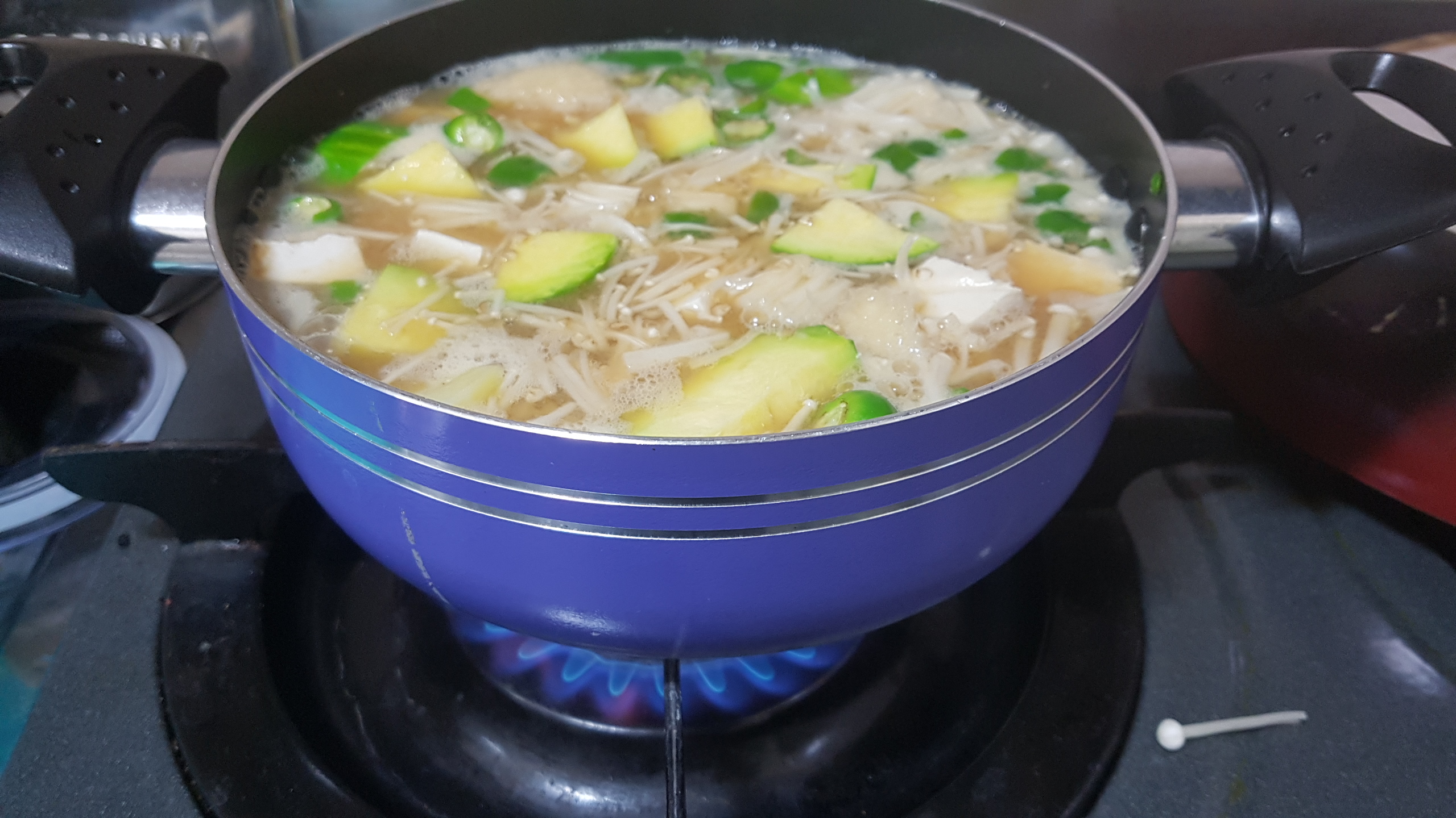 - 된장에 매운 고추까지 넣으면 맛이 짜게 변하니까 적절히 조절하세요. 사진의 냄비 수준이면 된장 한 숟가락 반(밥숟가락)에 매운고추 3~4개면 충 to the 분.