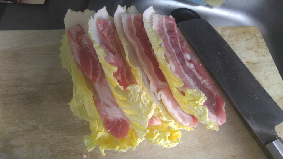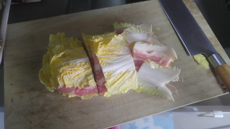 배추와 삼겹살을 준비해서, 겹겹히 쌓은채 사용하는 냄비에 맞게 적당히 썰어서 냄비에 넣어줍니다.