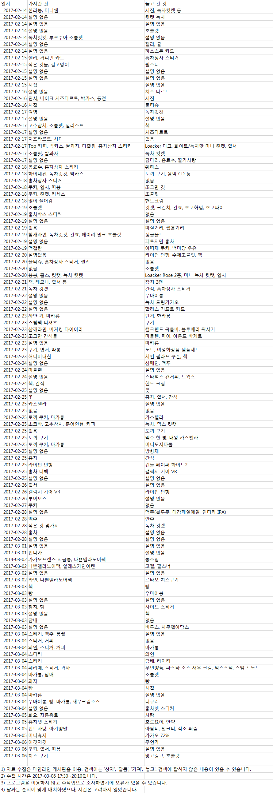 어라운드의 달콤창고 이용 내역은 기사를 통해 간접적으로 확인하는 것 외에는 살펴볼 수 없었고, 종각 홍차상자 이용 내역은 2017.2.14일부터 2017.03.06 20:10분까지 살펴보았습니다.
