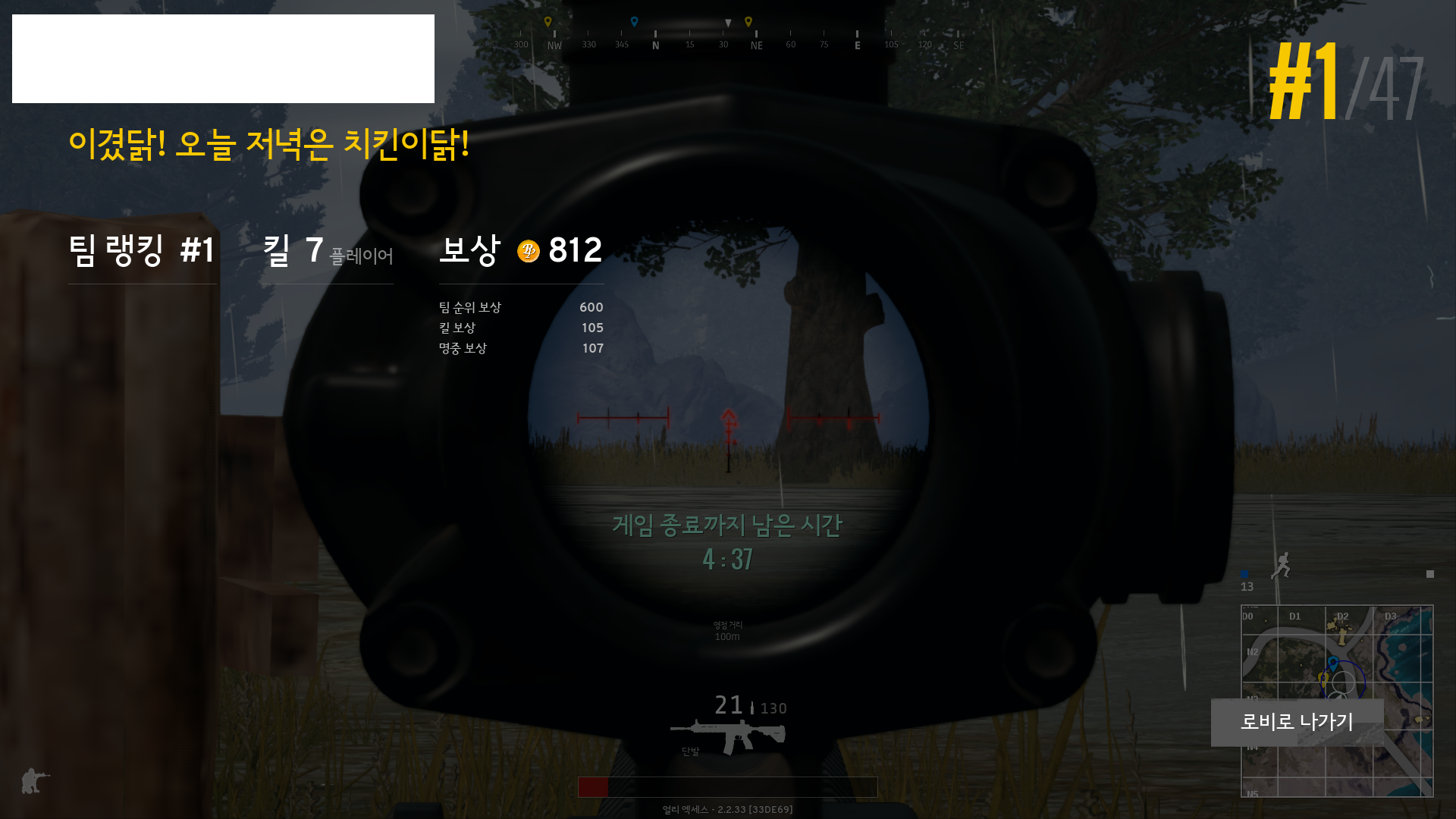 적 두명(듀오큐면 다 듀오로 들어옵니다)을 발견하면 누굴 쏠지 순간적으로 정하고 집중 사격도 하게 되더라고요.