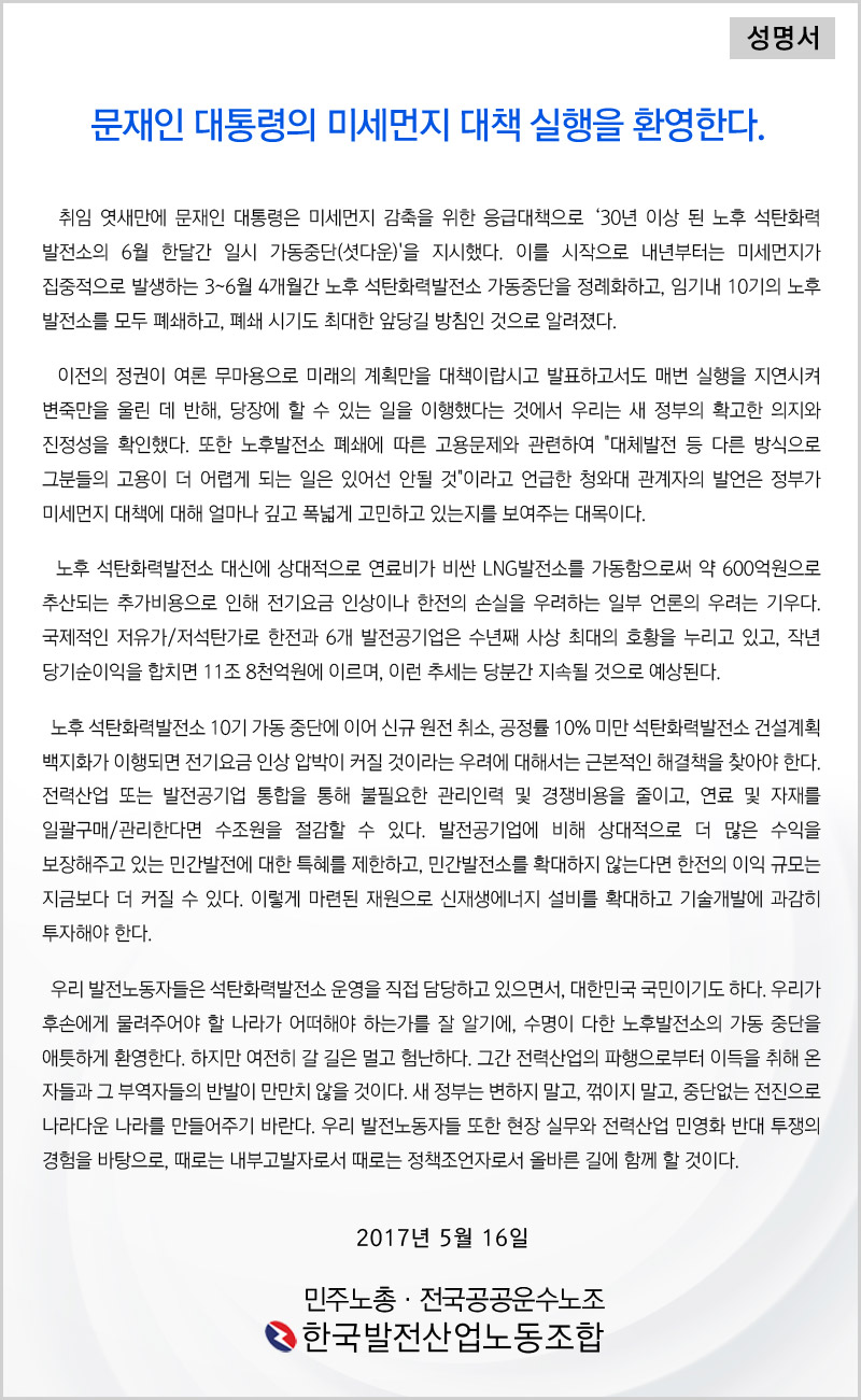 사회적 대의, 그것도 중국의 영향을 고려한다면 사실 정책 당사자 입장에선 왜 우리를 잡느냐고 할 수도 있는 일에 이익 이전에 사회적 연대로서 결정에 애틋하고 어렵게 동의를 선언한 민주노총 발전노조의 선언문입니다.