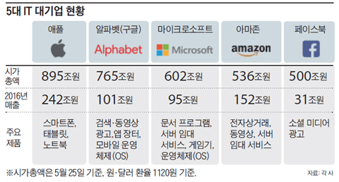 현재 전세계 시총 1~5위면서 IT 5대 기업인 위 5개 기업과 게임업계의 관계를 짤막하게 적어볼까 합니다. 제가 현재 몇년째 서비스 중인 모바일 게임을 기준으로 하면 - 애플 / 구글의 플랫폼에서 서비스 합니다. (매출의 30%를 수수료로 줍니다.. 물론 그 30% 안에는 결제 수수료와 통신사 수수료가 포함되어 있긴 합니다.) - 마소와 애플의 소프트웨어로 개발합니다. (마소의 윈도우 + 오피스 + 비주얼스튜디오 + 애플의 맥 + 엑스코드) - 아마존의 서버를 사용합니다. (글로벌 서비스 하는 게임업체의 대부분은 다 아마존 서버 씁니다.) - 페이스북의 이용자 통계를 활용합니다. (가입시에 페이스북으로 로그인 한번 누른. 그 내용 하나로 페이스북에서 정량화된 정보를 제공해줍니다.) - 구글과 페북을 활용해서 유저를 모객합니다. (구글, 페북의 광고 시스템은 정말.. 글로벌 모객은 이넘들 만한게 없습니다.. 네이버 광고처럼 특정 국가 특화 광고랑은 또 별개의 영역이라..) 위 내용은 '왠만한 모바일 게임 회사'는 다 통용된다고 생각하셔도 됩니다 -.-;; 대부분의 사람들이 아마존, 페이스북에 대해선 그냥 책파는 회사, SNS 회사 정도로만 알고 있는 경우가 많아서.. 위 IT 5대기업이.. 생각보다 IT 업계에서 먼가 개발을 해보시면... 현재 미치고 있는 영향력이 정말 장난이 아닙니다 -.-;; 뭐 요즘엔 지들끼리 컨소시엄 구축해서 미래먹거리 표준들도 결정하는 마당에... 2