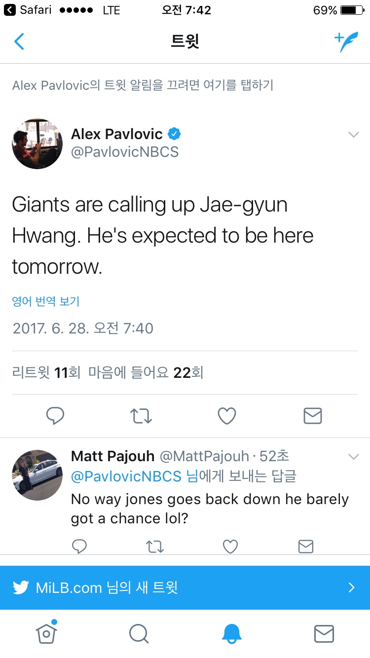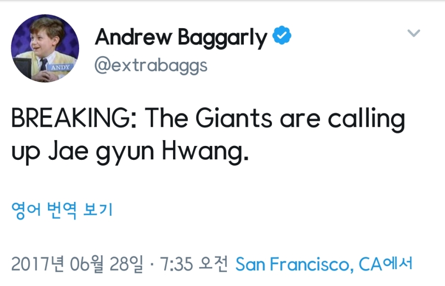 안녕하세요 김치찌개입니다! 축하합니다 황재균선수~ Andrew Baggarly BREAKING: The Giants are calling up Jae gyun Hwang. Alex Pavlovic Giants are calling up Jae-gyun Hwang. He's expected to be here tomorrow. 1