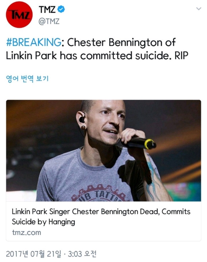 린킨파크 보컬  체스터 배닝턴이 자살했다는 소식이네요
