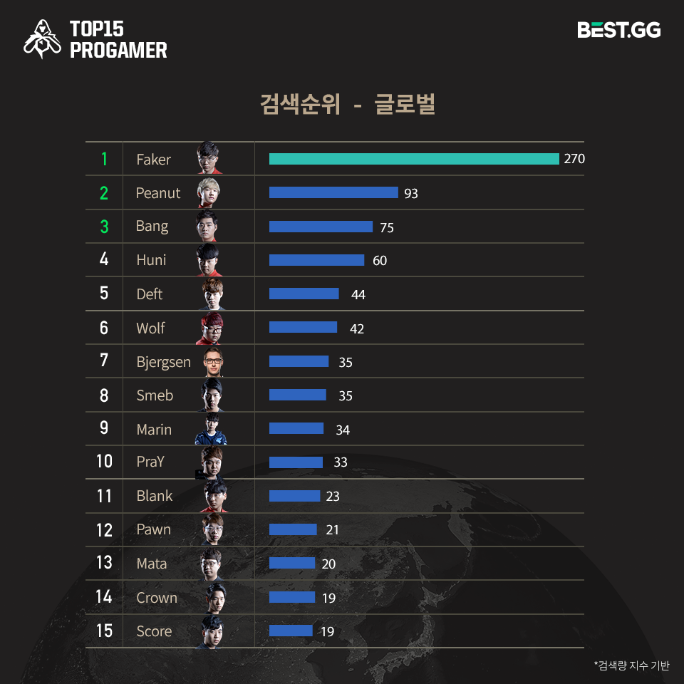 팀별로는 SKT 6명 (후니, 피넛, 블랭크, 페이커, 뱅, 울프) KT 5명 ( 스맵, 스코어, 폰, 데프트, 마타) 삼성 1명 (크라운) 롱주 1명 (프레이) 아프리카 1명 (마린) TSM 1명 (비역슨) 라인별로는 탑 - 후니 / 스맵 / 마린 정글 - 피넛 / 블랭크 / 스코어 미드 - 페이커 / 폰 / 크라운 / 비역슨 원딜 - 뱅 / 데프트 / 프레이 서포터 - 마타 / 울프 가 검색순위 탑 15에 올랐습니다. 팬들에게던, 안티팬에게던.. 가장 많은 관심을 받는 선수들.. 이라고 보면 될 것 같네요. 롤드컵을 3번이나 먹으면서 전세계 최고의 팀으로 군림하고 있는 SKT의 인기와 SKT를 잡기 위해 모인 드림팀인 KT의 인기가 압도적인 상태에서 프레이, 마린, 크라운이 비집고 들어간 상태라고 보면... 삼성이 작년 롤드컵을 기점으로 강팀으로 올라서면서 팬들에게 인정받고 있는게 크라운이라는 지표로 봐도 될것 같기도 하네요. 프레이와 마린은 원래부터 스타플레이어였으니.. 0