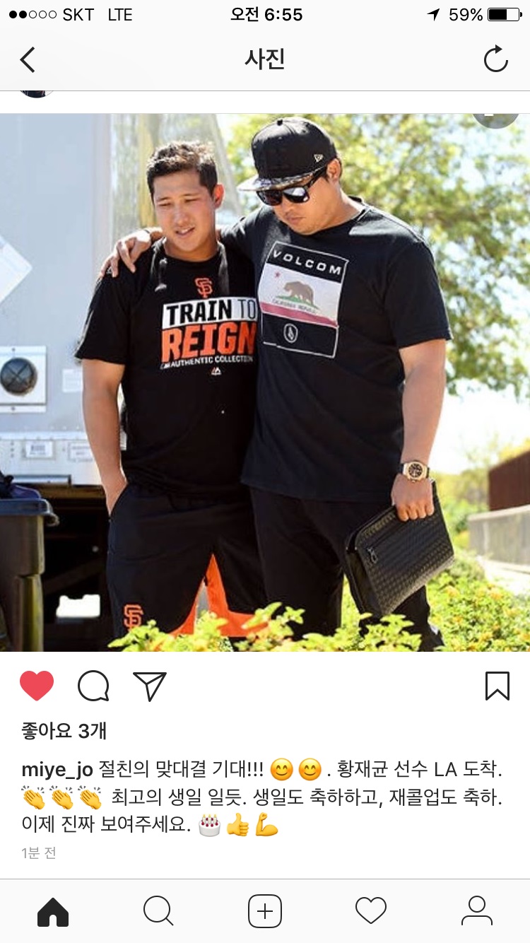 Henry Schulman ✔ @hankschulman Hwang is in LA. No move yet. Someone's going on the DL and that's not all complete. 안녕하세요 김치찌개입니다! 조미예 기자님 인스타 사진입니다 LA 도착했네요 류현진선수와의 대결이 벌써부터 기다려지는군요 축하합니다 황재균 선수~ 0