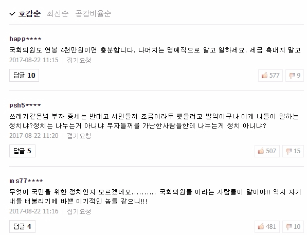 http://news.naver.com/main/read.nhn?mode=LSD&mid=sec&sid1=100&oid=003&aid=0008133296 *** 참고로 이 뉴스에 대한 의견들을 가저온것이지 그것에 동의한다는 의사표시를 한건 아님을 밝힙니다. 이미 다른 커뮤니티 게시판에선 이 법 개정안때문에 왈가왈부 하고 있더라구요 그래서 가져와봅니다. 제가 이 부분을 뉴스게시판이 아닌 자유게시판 역활인 티타임 게시판에 올린 이유는 지난번 '문제인 케어'처럼 국민 개개인한테 미치는 파급력이 큰거 같아서 단순 가쉽성으로 대할수 없다고 생각했기 때문입니다. 비록 야당의원 그중에서 바른정당 소속 의원분들이 법안 발의자의 대부분을 차지하고 있지만 결국 여당이든 야당이든 중간정도의 복지를 위해서라면 근로소득자의 면세자 비율을 줄이는건 필연이라고 보여지고 결국은 '월 만원'이라는 최소한의 부담에 대해 국민들이 어떻게 받아들일까하는 걱정과 기대가 섞여있는게 제 생각입니다. 과연 여러분들은 어떻게 생각하십니까? 0