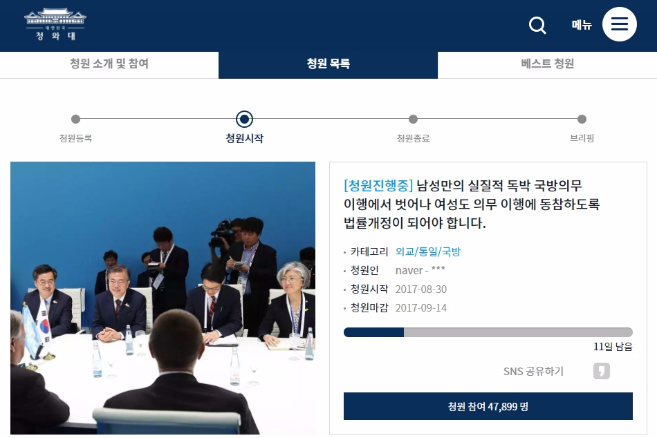 Subject   청와대 청원게시판에 여성징병제 의견이 올라왔군요