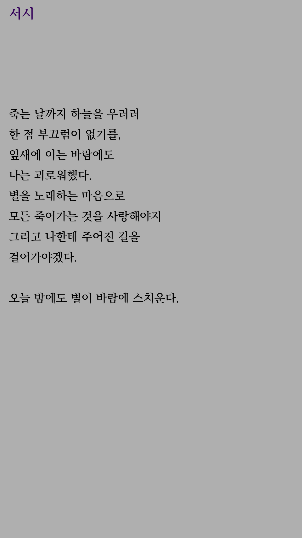 또 새벽 다섯시부터 이래라 저래라하는 전화벨이 울린다. 온갖 부정적인 감정을 전달하며 피와 오줌을 담고 심장 소리를 듣는다. 숨 좀 돌리려니 또 일할 생각에 숨이 막힌다. 담배 한대 피면서 핸드폰으로 윤동주 시집을 열었는데 맨 앞에 있는 서시부터 한구절 한구절이 가슴을 조인다. 보탤 것도 없고 뺄 것도 없이 마음에 울린다. 시는 밑줄 그으면서 이해하는 것이 아니구나. 처음으로 눈이 아니라 가슴으로 시를 읽었다. 하늘을 우러러 너무 부끄럽다. 4