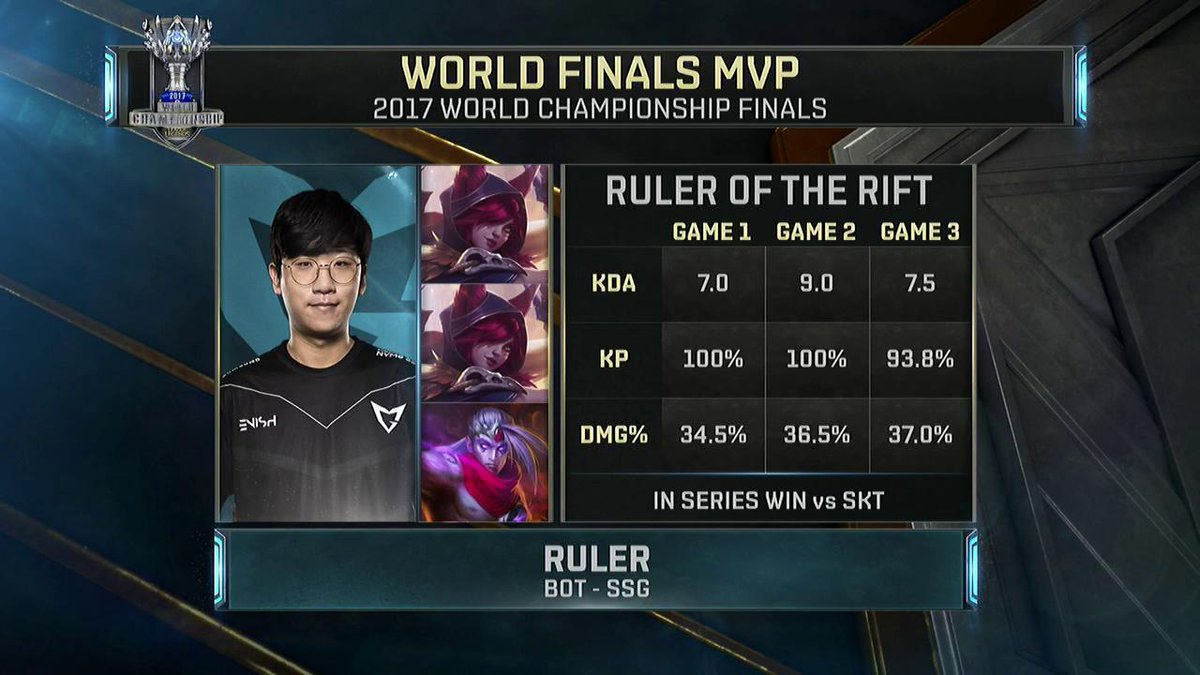 - 역대 라이엇 국제대회 Final MVP 리스트 14 롤드컵 - Mata (삼성화이트, 서포터) 15 MSI - Clearlove (EDG, 정글러) 15 롤드컵 - Marin (SKT, 탑) 16 MSI - Faker (SKT, 미드) 16 롤드컵 - Faker (SKT, 미드) 17 MSI - Wolf (SKT, 서포터) 17 롤드컵 - Ruler (삼성, 원딜) > 12,13 롤드컵은 공식적으로 뽑지 않음.. * 포지션별로 구분시 탑 - Marin 정글 - Clearlove 미드 - Faker 원딜 - Ruler 서포터 - Mata, Wolf * 롤드컵으로 구분시 탑 - Marin 정글 - 없음 미드 - Faker 원딜 - Ruler 서포터 - Mata - 역대 라이엇 국제대회 우승팀 목록 11 롤드컵 - Fnatic (유럽) 12 롤드컵 - TPA (대만) 13 롤드컵 - SKT K (한국) 14 롤드컵 - 삼성 화이트 (한국) 15 MSI - EDG (중국) 15 롤드컵 - SKT (한국) 16 MSI - SKT (한국) 16 롤드컵 - SKT (한국) 17 MSI - SKT (한국) 17 롤드컵 - 삼성 (한국) 0